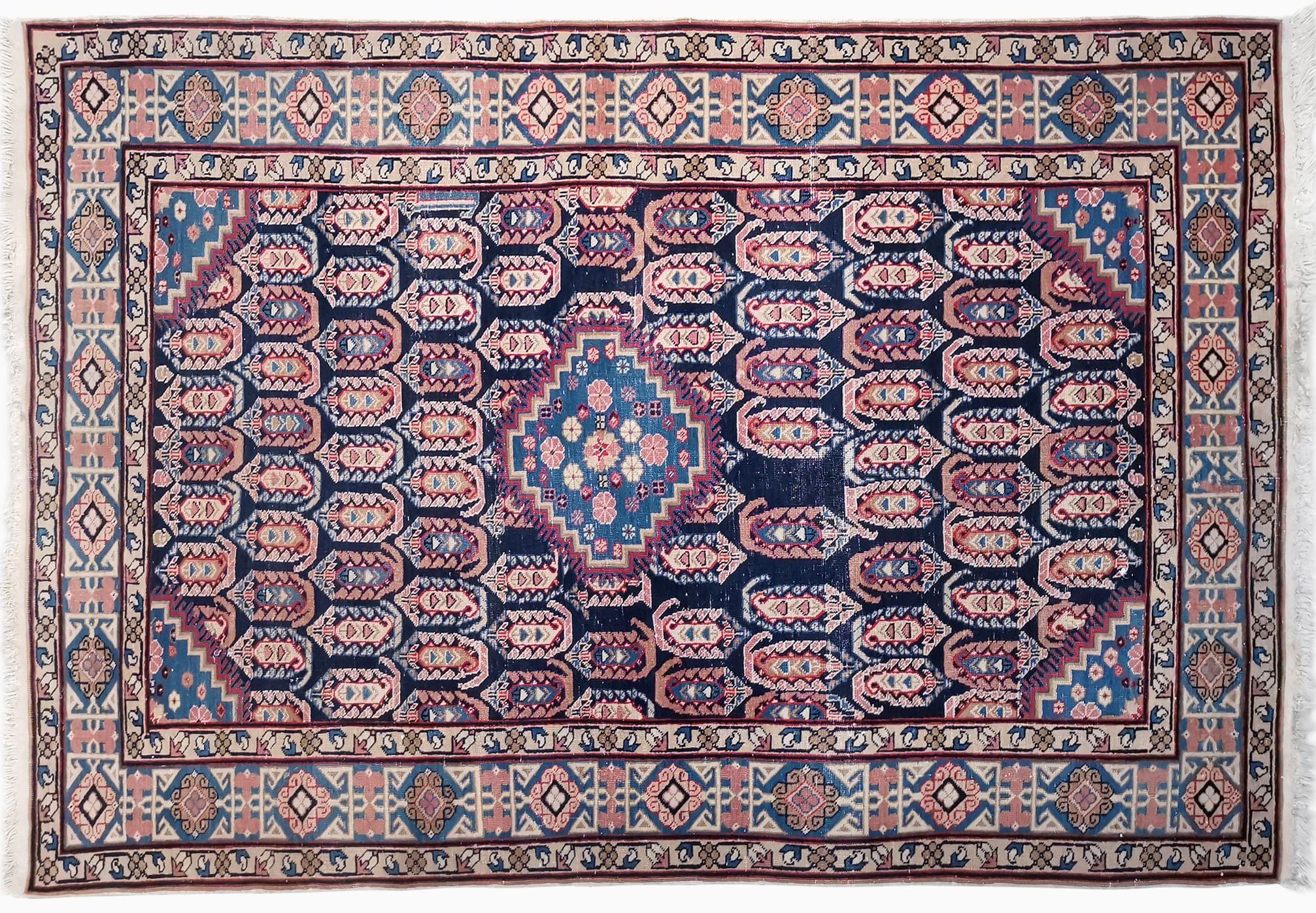 Laine à motif de vases sur fond bleu à bordure crème, 310x400 cm