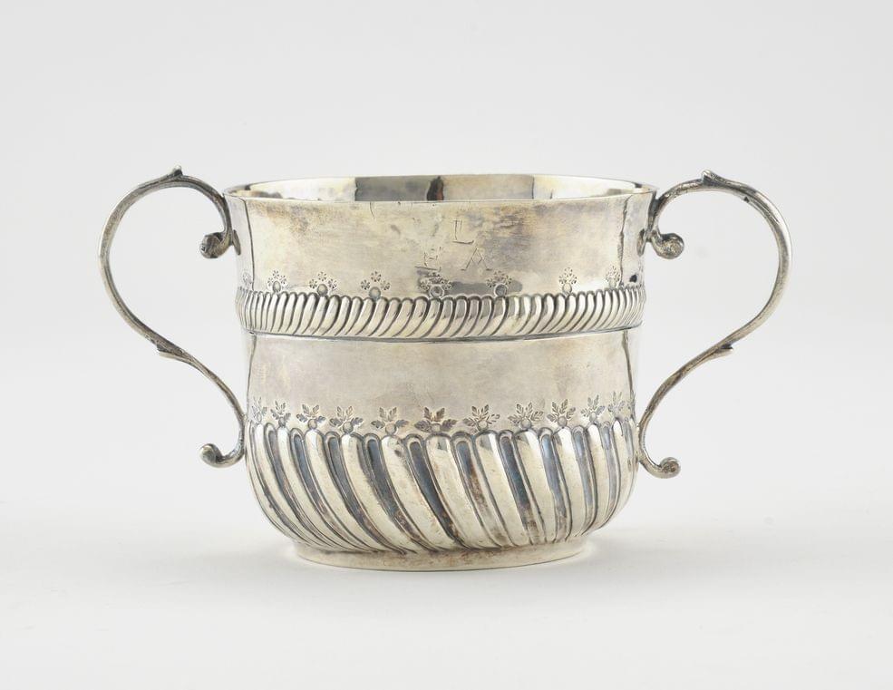 Décor repoussé de godrons torses et de fleurs, Londres 1694, orfèvre IC couronné, argent, H 8,5 cm, 145 g