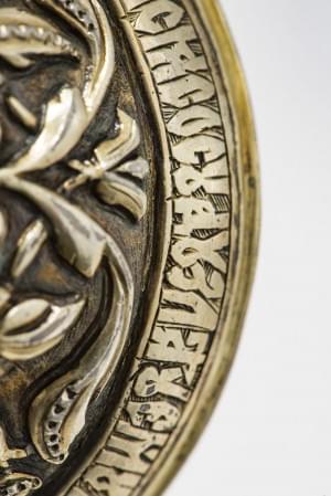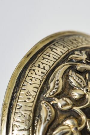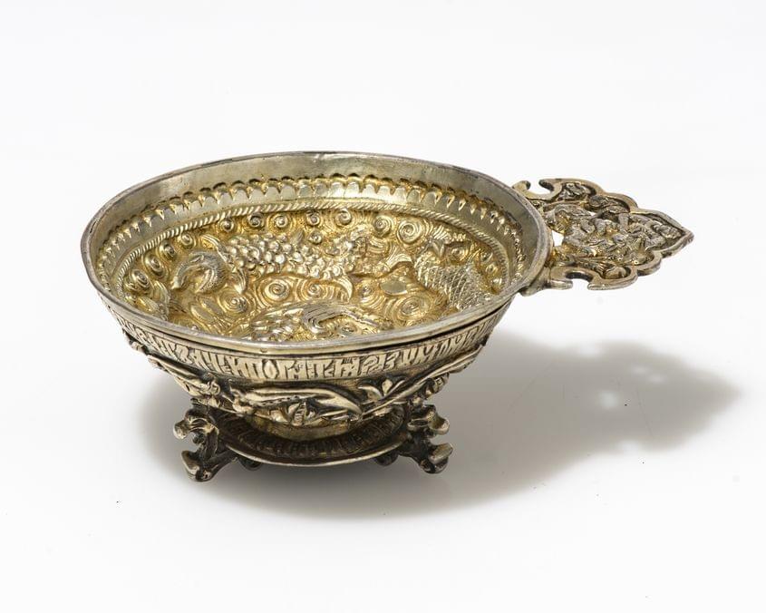 74. Tcharka à décor repoussé à l'intérieur d'animaux marins et de rinceaux à l'extérieur surmonté par l'inscription vyaz: „ИСТИННАЯ ЛЮБОВЬ УПОДОБИСИЯ СОСУДУ ЗЛАТУ ЕМУ ЖЕ РАЗБИТИЕ НЕ БЫВАЕТЬЯ ЧЕМ ПОГНЕТСИЯ РАЗУМОМЪ ИСПРАВИТСИЯ“ (Le vrai amour est comme un vase d'or, il ne peut pas être brisé et s'il est cabossé, il peut être réparé par l'esprit), la prise à décor de Samson ouvrant la gueule du lion, gravé au verso: "Charka of the Stolnik Ivan Moïsevitch Glebov", le pied en forme de trois chimères, Russie, XVIIe s, vermeil, D 8 cm, 100g