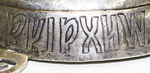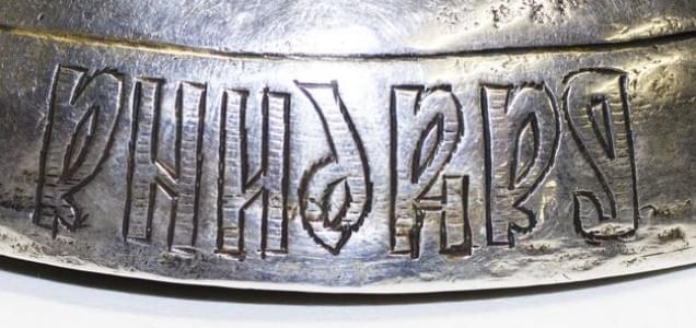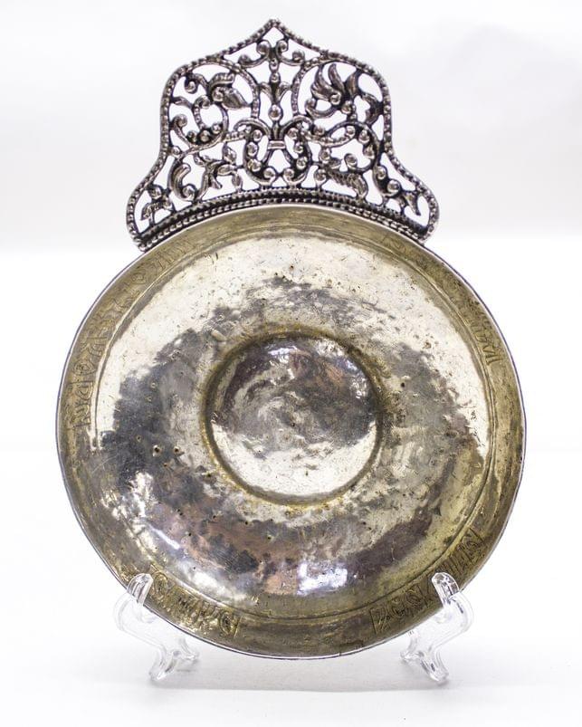 76. Tcharka unie à anse ajourée de rinceaux et portant l'inscription "Чашка боярина Михаила Троерукова" (Tcharka du boyard Michael Trojerukov), Russie, XVIIe s, argent, D 14 cm, 150 g