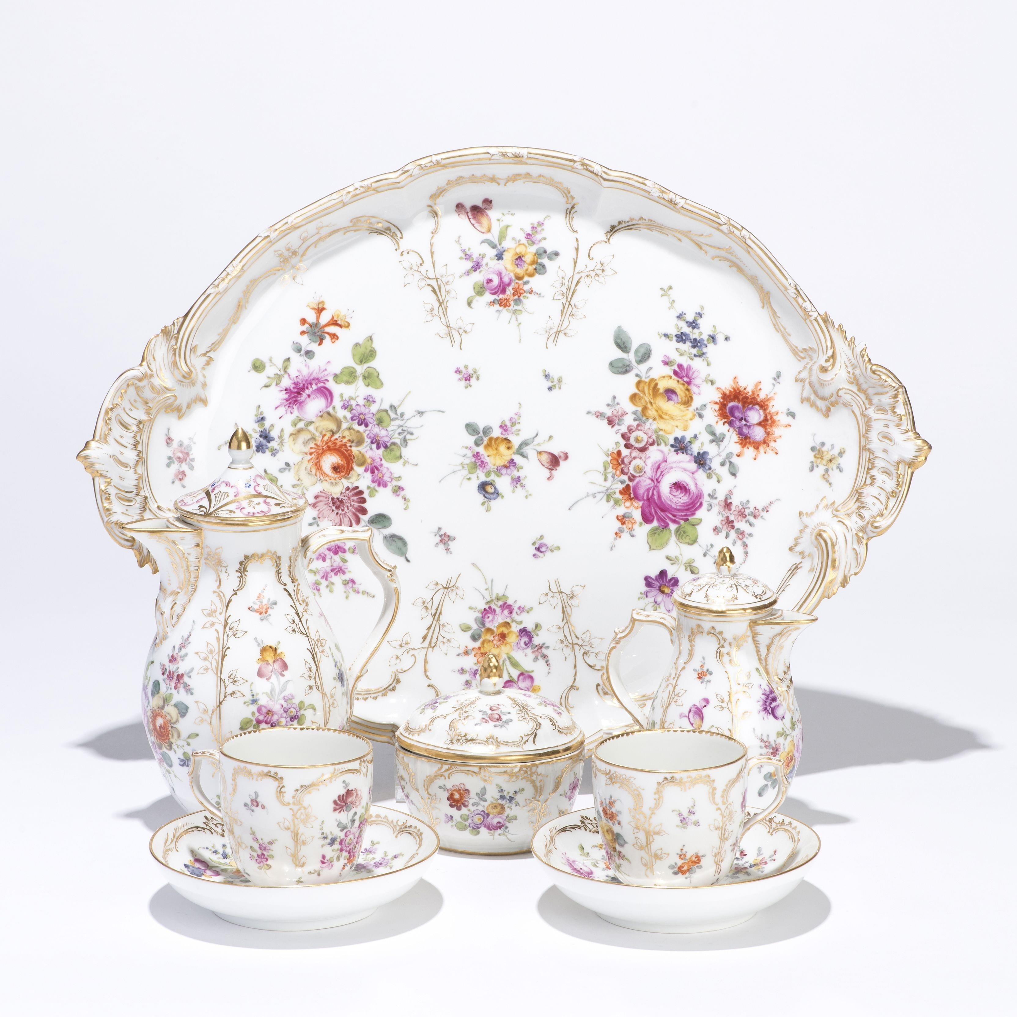 Berlin, KPM (Königliche Porzellan Manufaktur), porcelaine, comprenant: Verseuse, pot à lait, sucrier, deux tasses, plateau (6p)