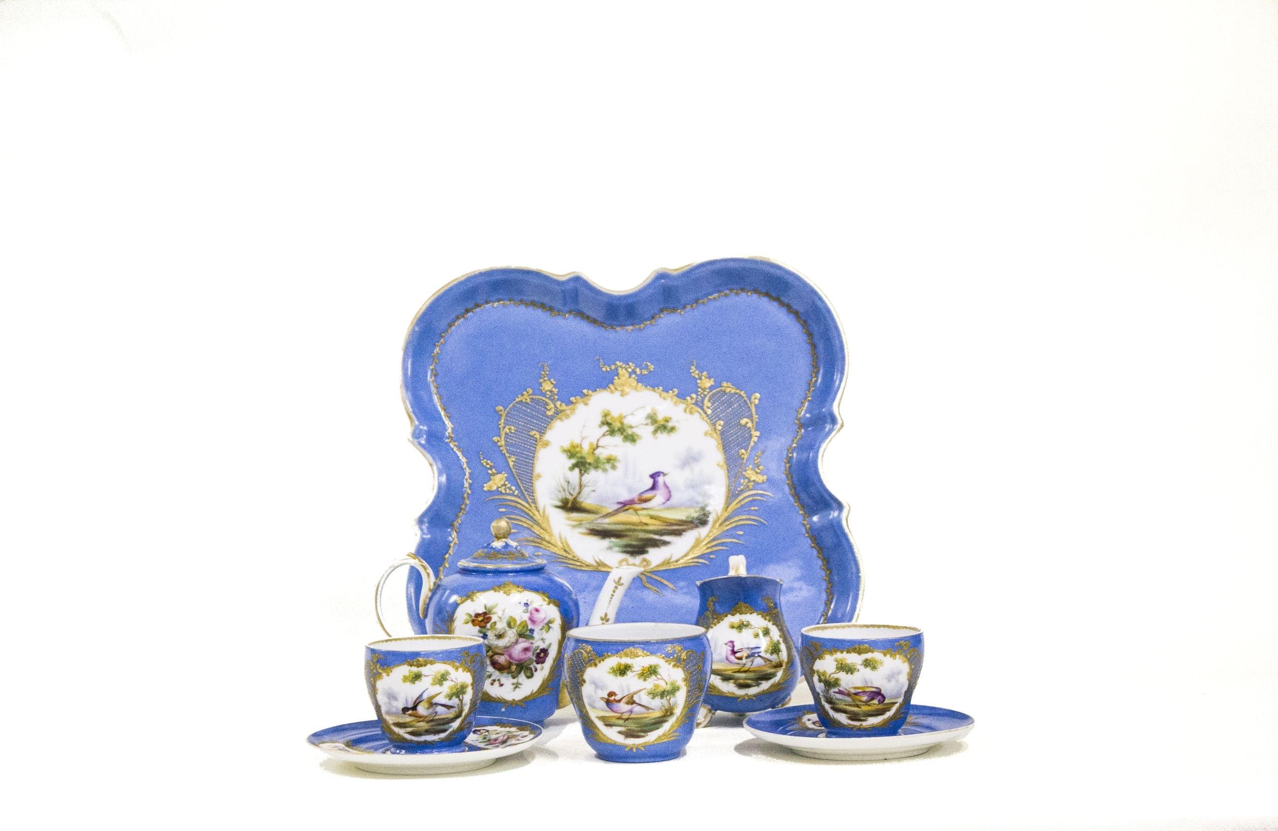Porcelaine, comprenant: théière, crémier, sucrier, deux tasses et un plateau