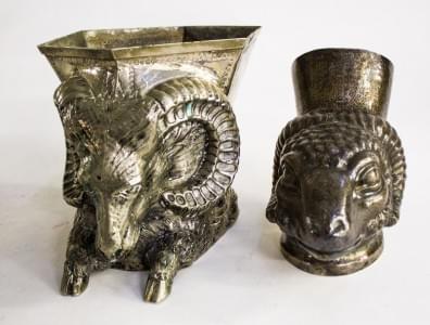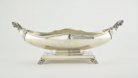 176. Grande coupe centre de table ovale à anse tête de léopard et pie...