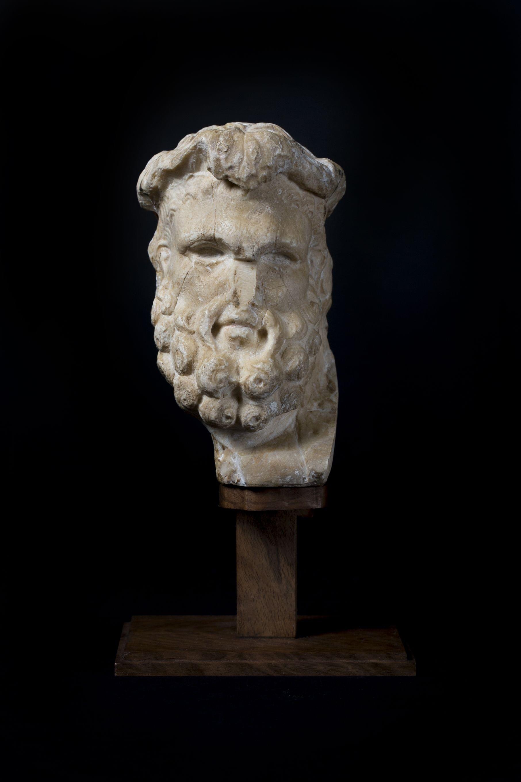 Figuré la barbe bouclée, une couronne de pampre de vigne ceignant sa chevelure, élément supérieur d'un terme, marbre de chemtou, H 15,5 cm. Provenance: Bonhams, Londres, 23 octobre 2013, Collection privée américaine, Californie, Bonhams, Londres, 26 avril 2001, Marché de l'art, Londres, années 1990.