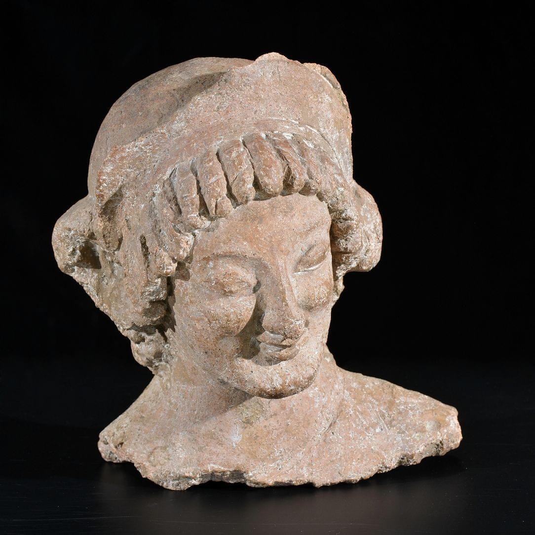 Elle porte un diadème et les cheveux réunis en chignon à l'arrière, terre cuite, copie XIXe s d'après un original étrusque, probablement par le faussaire Alceo Dossena, H 33 cm. . Provenance: Collection d'un aristocrate italien résidant à Genève donnée dans les années 1970 au père de l'actuel propriétaire; collection privée genevoise depuis lors