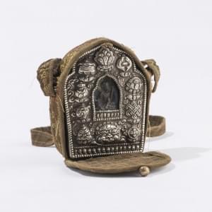 Métal argenté à décors auspicieux repoussés, pochette en tissu,...