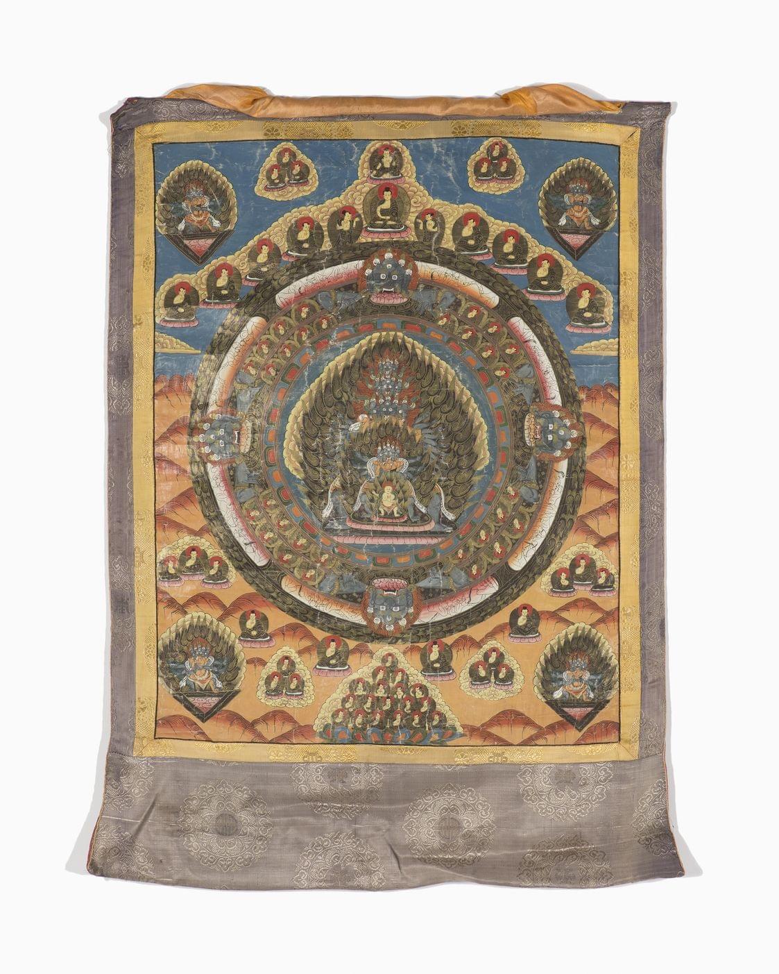 Toile peinte à décor de divinités polychromes, encadrement en soie, Tibet, circa 1900, 100x72 cm