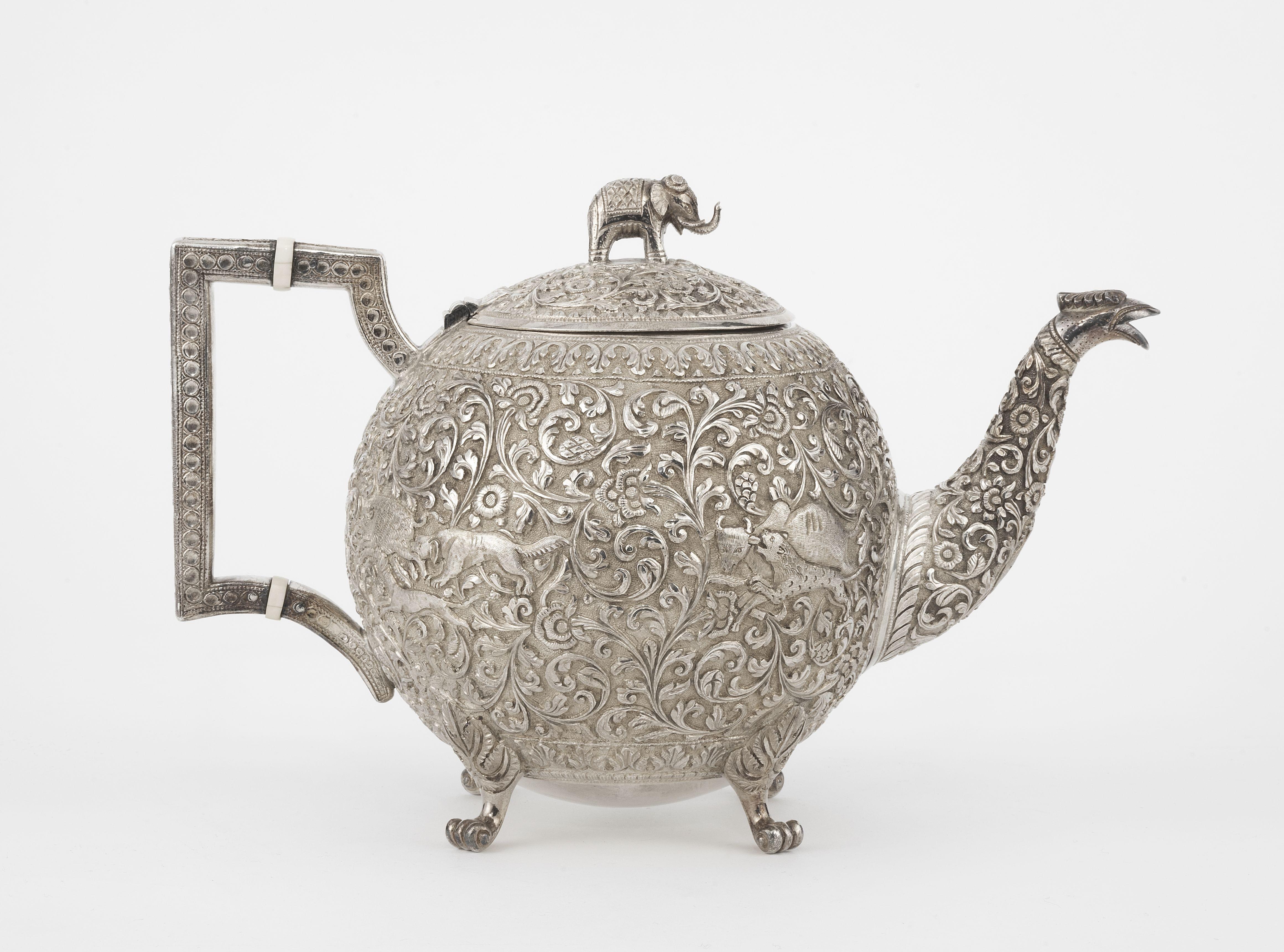 3876. Théière boule à décor de rinceaux et scènes de chasse