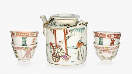 280. Théière et 4 tasses dans un écrin en osier, Chine, époque Républ...