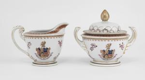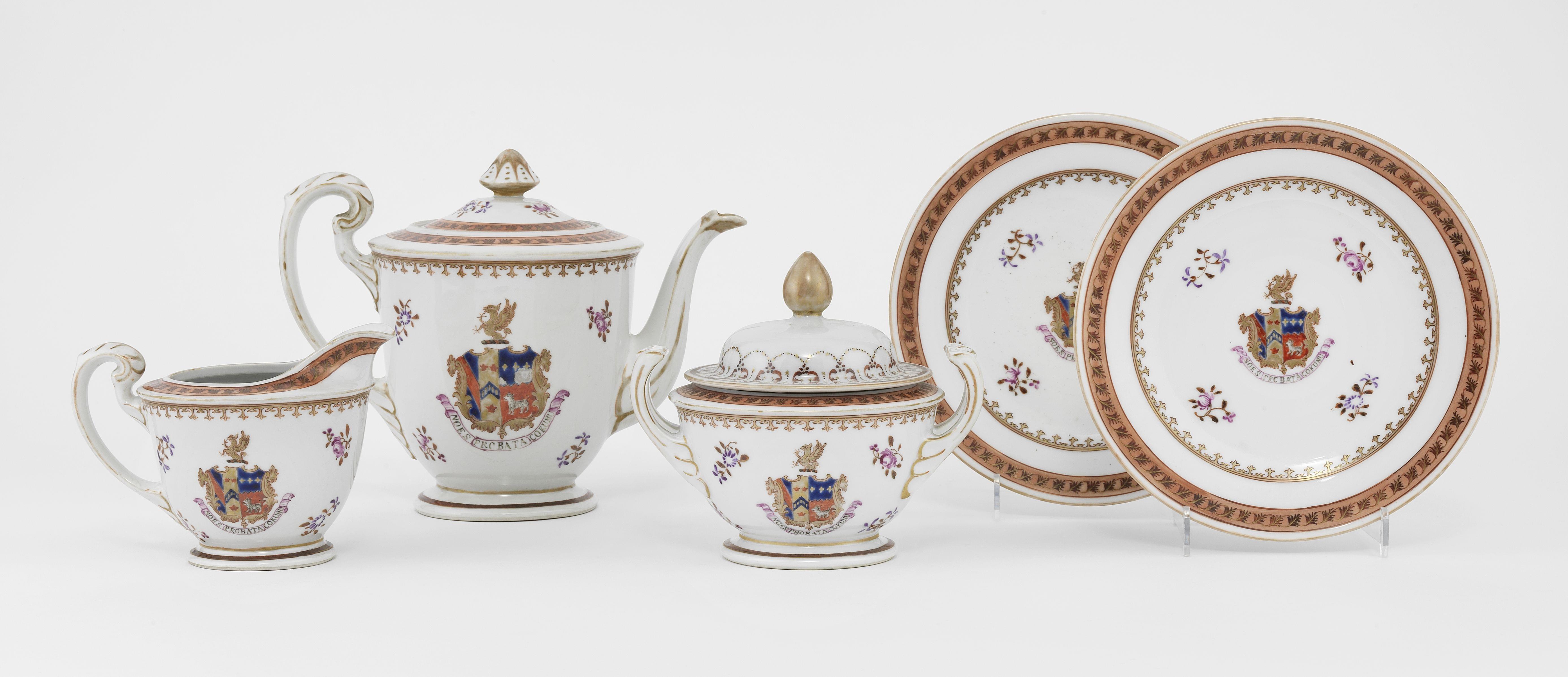 4887. Théière, pot à lait, sucrier et deux assiettes, Chine, Compagnie des Indes, XVIIIe s