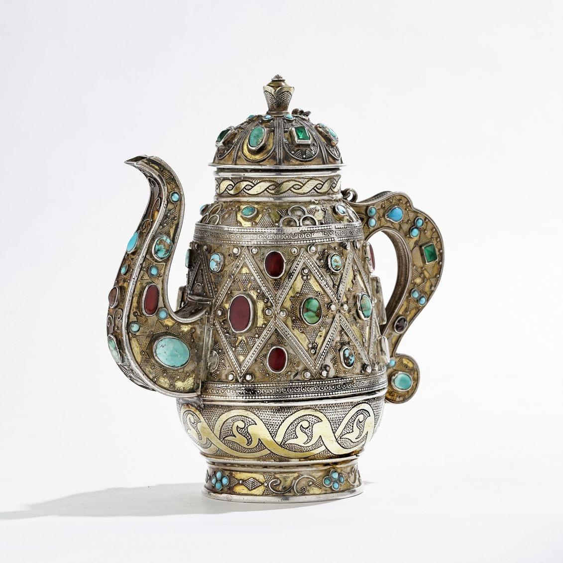 Argent partiellement doré et cabochons de pierres dures, H 18 cm. Une théière similaire est conservée au Met à New-York, ref. 2005.443.11a, b