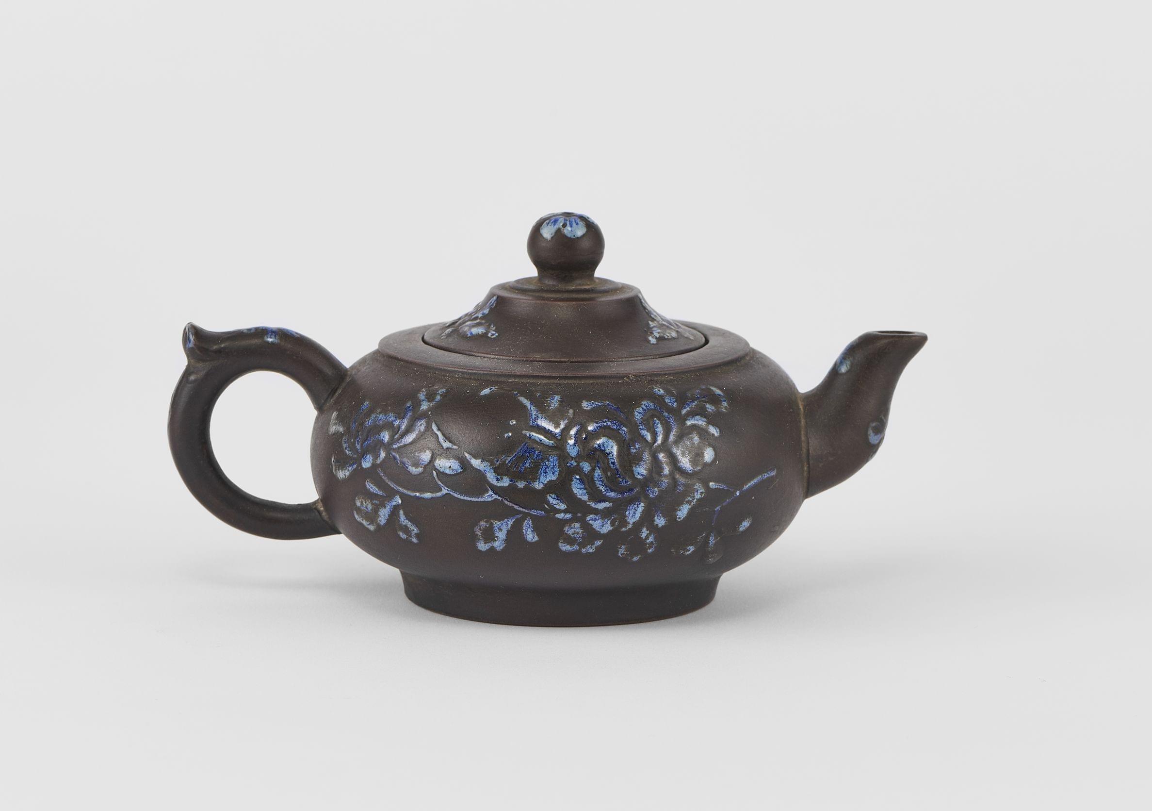 454. Théière en forme d'homme barbu, décor d'oiseaux en réserves, ans...