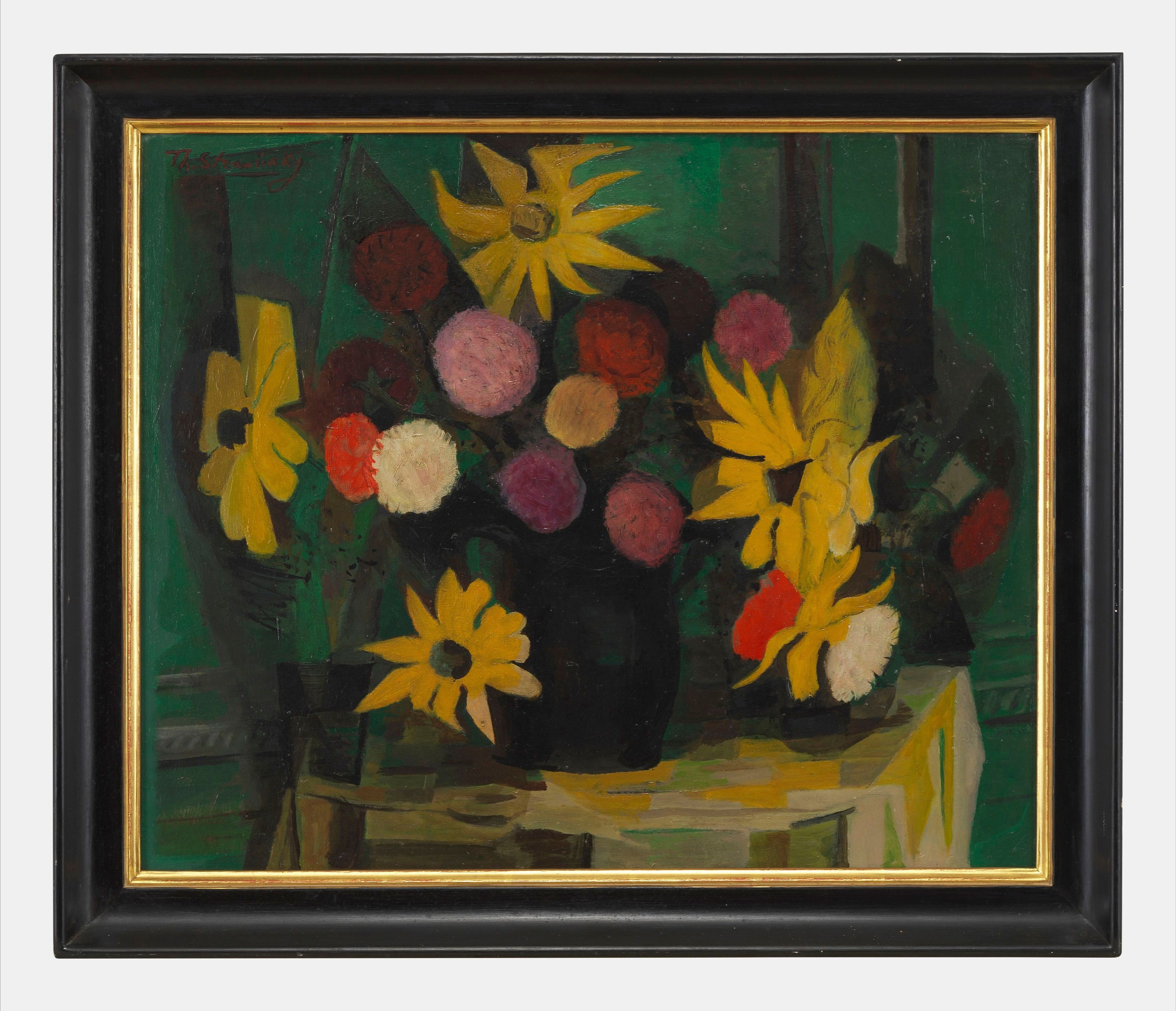 Nature morte aux dahlias, huile sur toile, signée, 46x54,5 cm