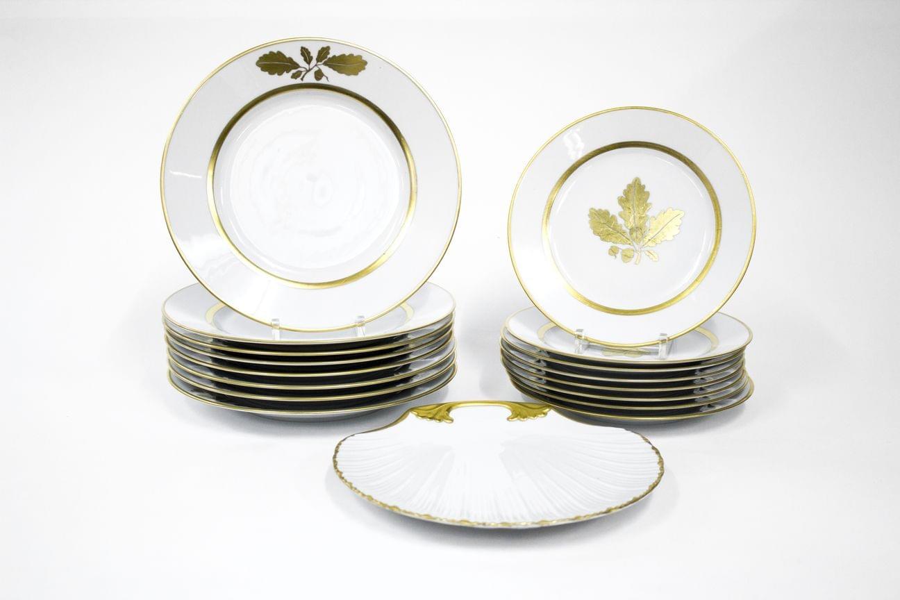 Thomas de Lussac 8 grandes assiettes, 8 petites à décor de feuilles et 1 plat en forme de coquillage, porcelaine émaillée blanc et or, D 22 et 27 cm