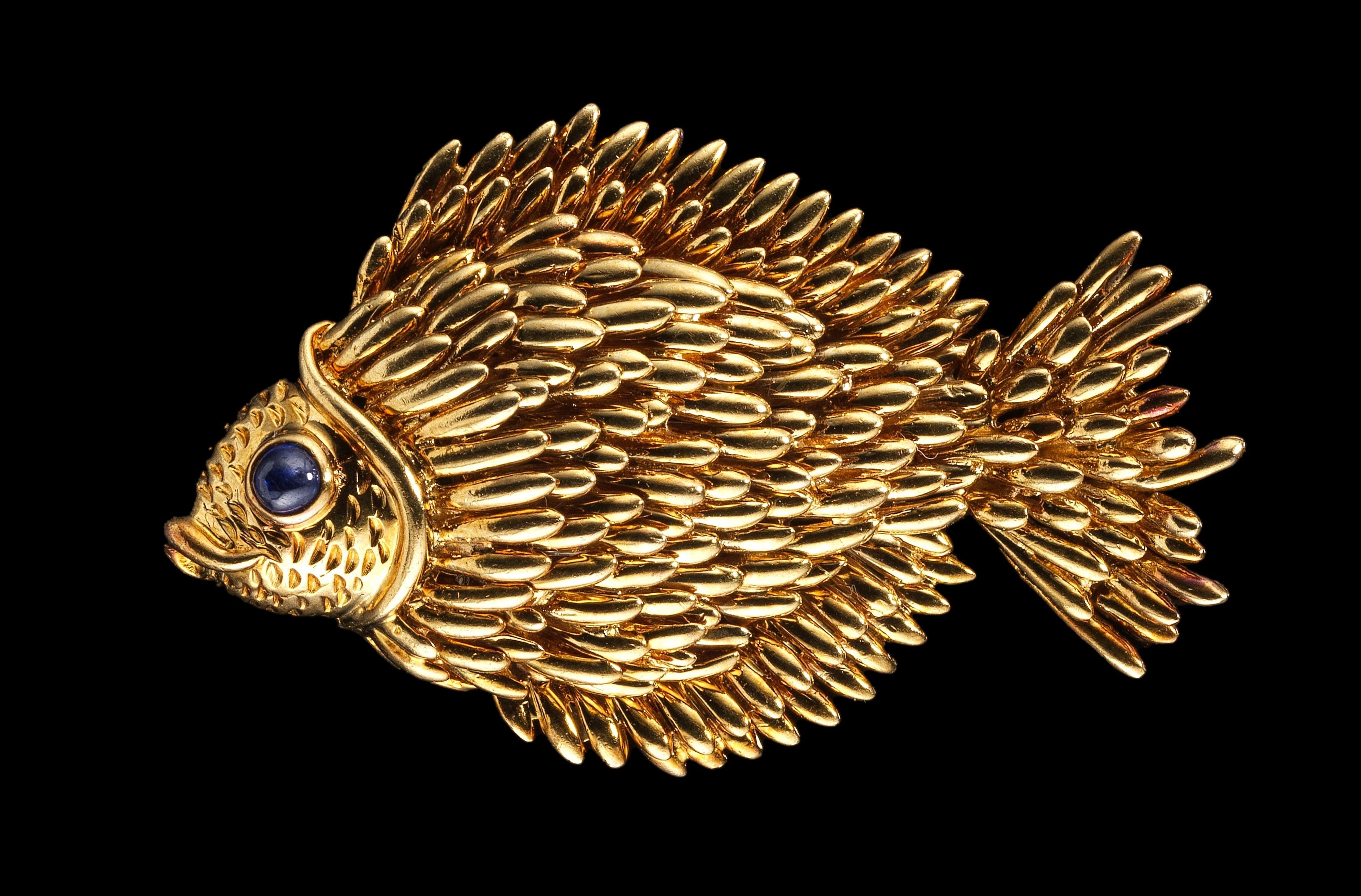 104. Tiffany, broche à motif de poisson à l'œil serti d'un saphir taille cabochon