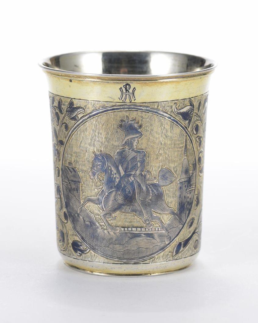 146. Timbale à décor niellé de médaillon dans des rinceaux, cavalier, probalement le tsar Alexandre Ier et paysage urbain