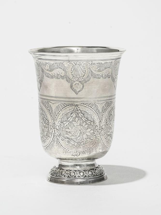 383. Timbale tulipe d'époque Louis XVI à décor ciselé d'entrelacs et gravée de lambrequins, médaillons et guirlandes,