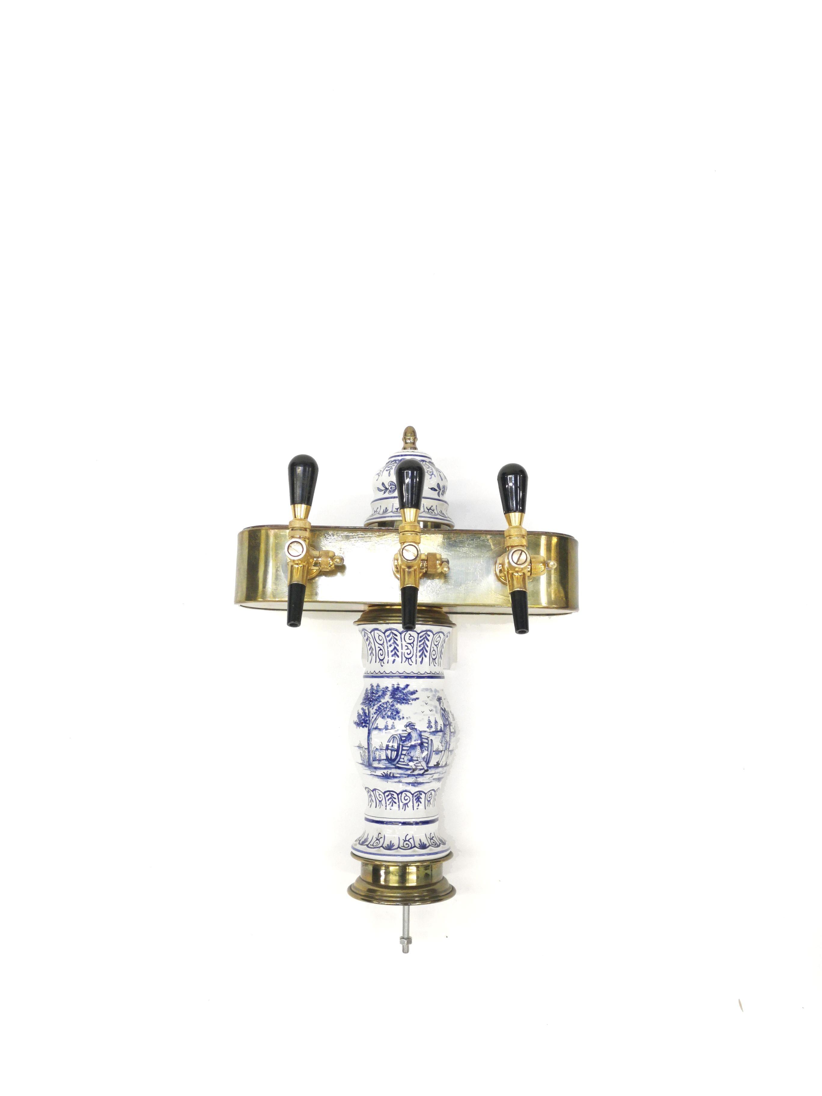 Trois robinets, métal et corps en faïence bleue et blanche à décor de tonnelier, H 50 cm