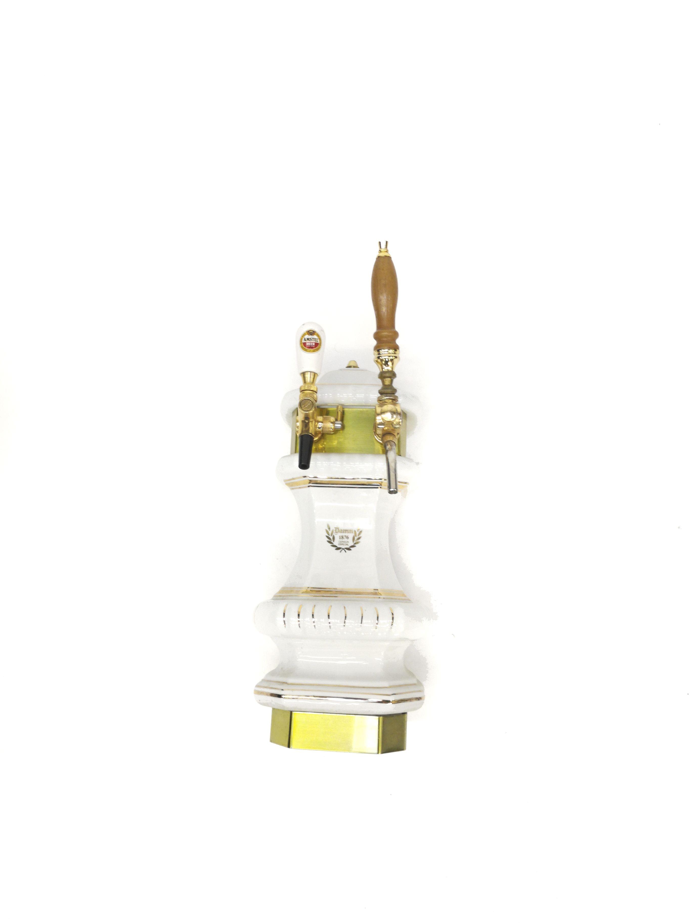 Deux robinets, métal et corps en porcelaine blanche, H 58 cm