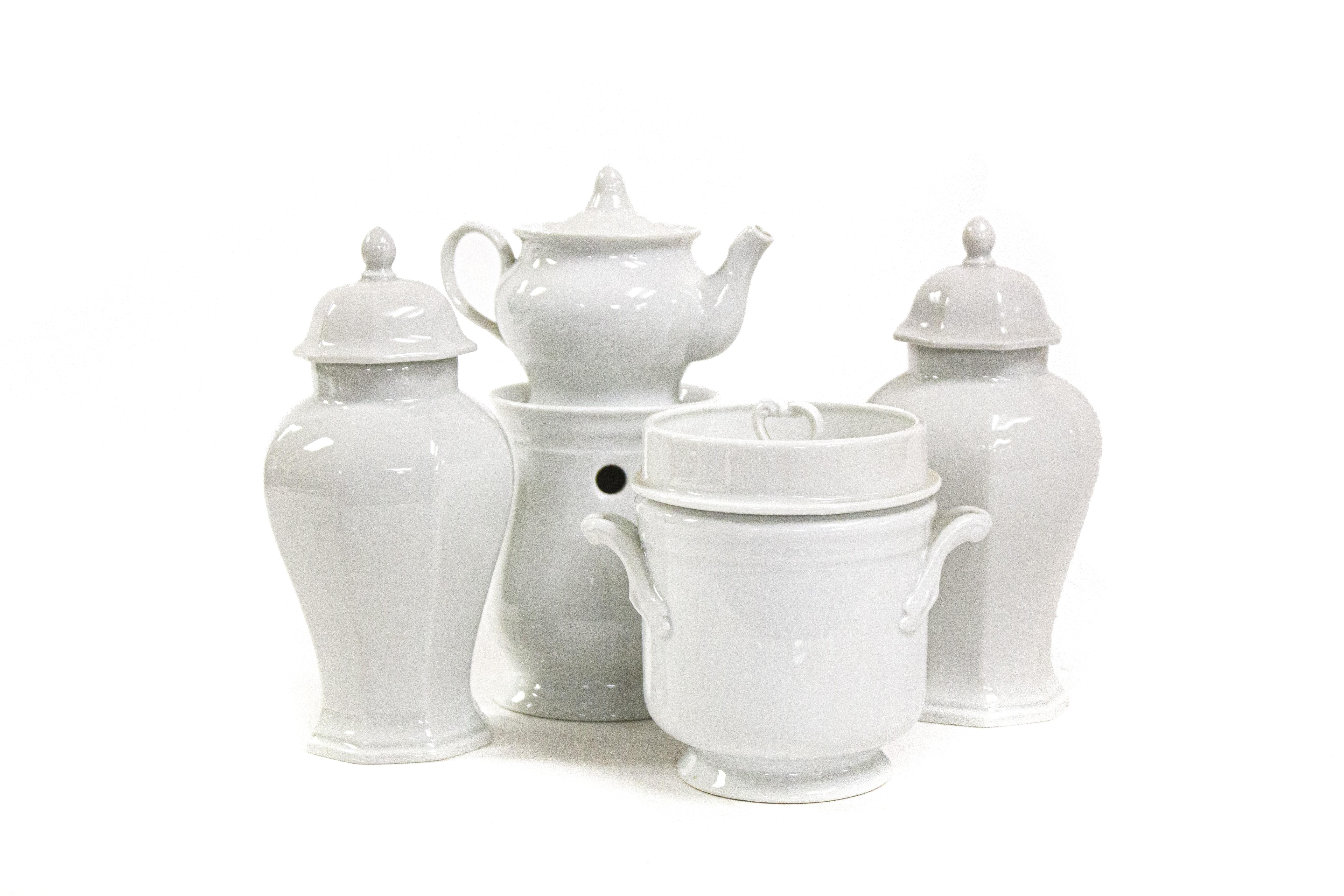 3976. Tisanière, paire de potiches couvertes à pans et petite glacière