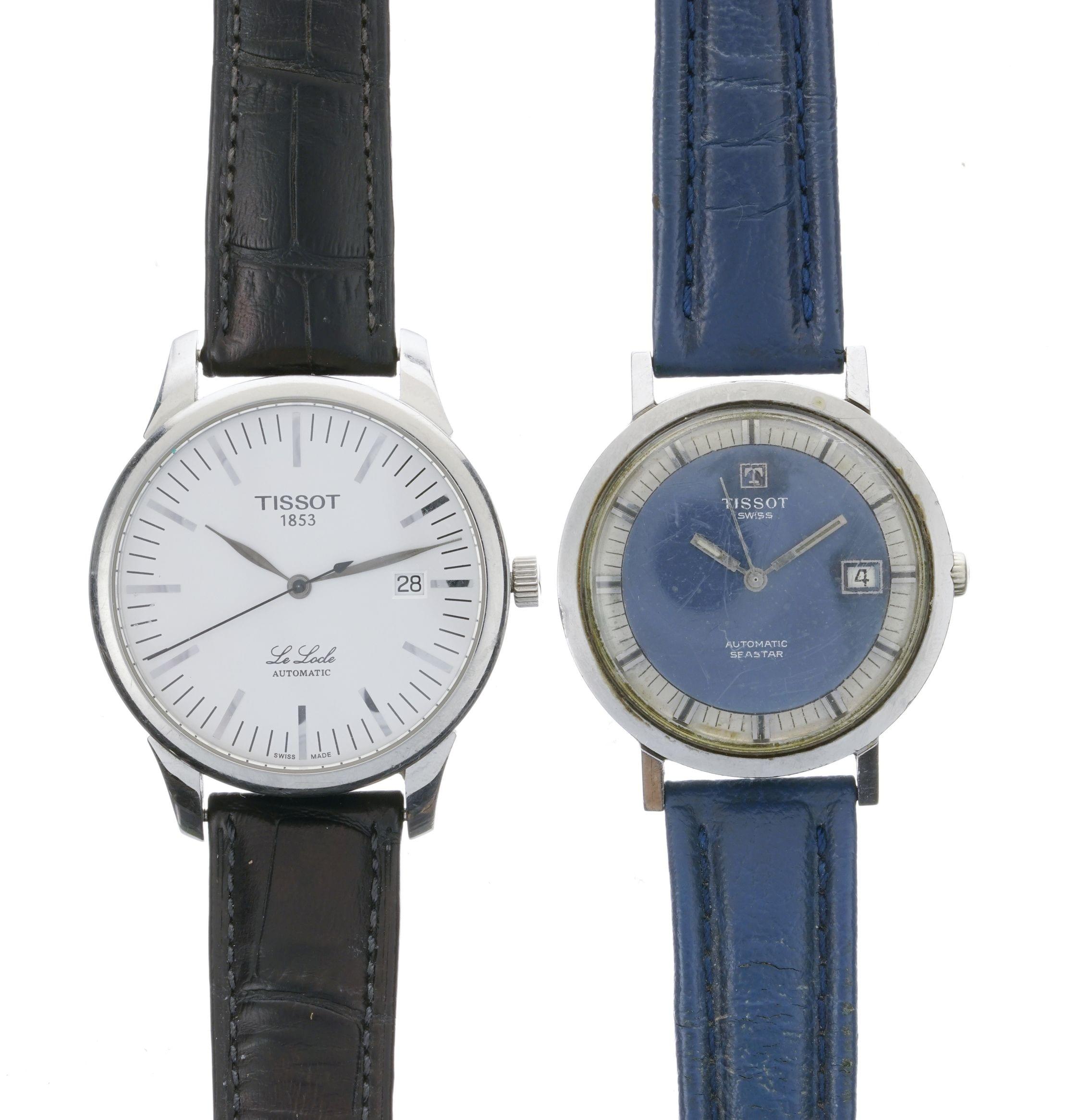 L'une à cadran gris, aiguilles et index bâton argentés, date à guichet à 3h, acier, D 40 mm, l'autre à cadran bleu, aiguilles et index bâton argentés, date à guichet à 3h, acier, D 35 mm
