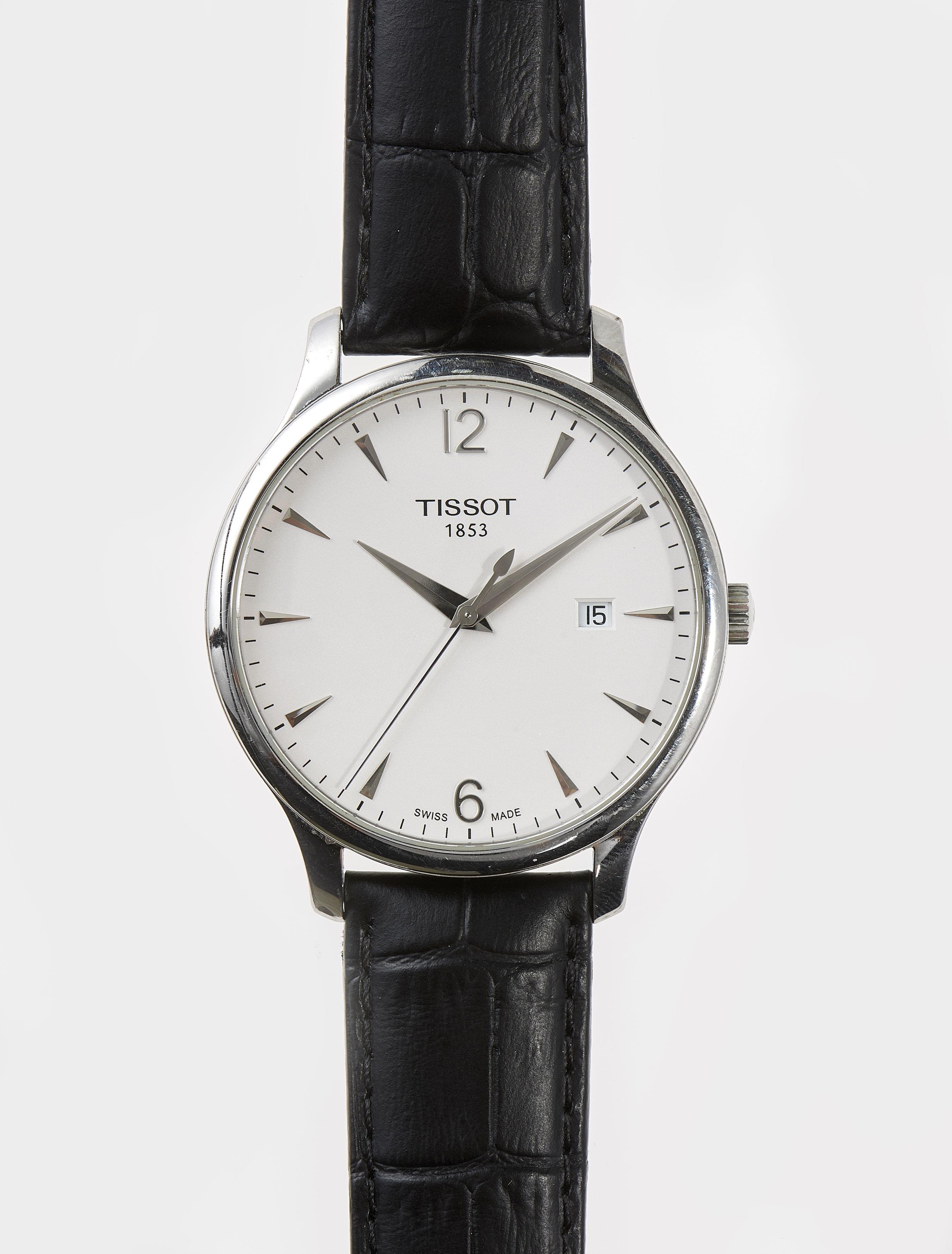 Cadran blanc, aiguilles argentées, index triangulaire et chiffres arabes argentés, date à guichet à 3h, acier, D 42 mm