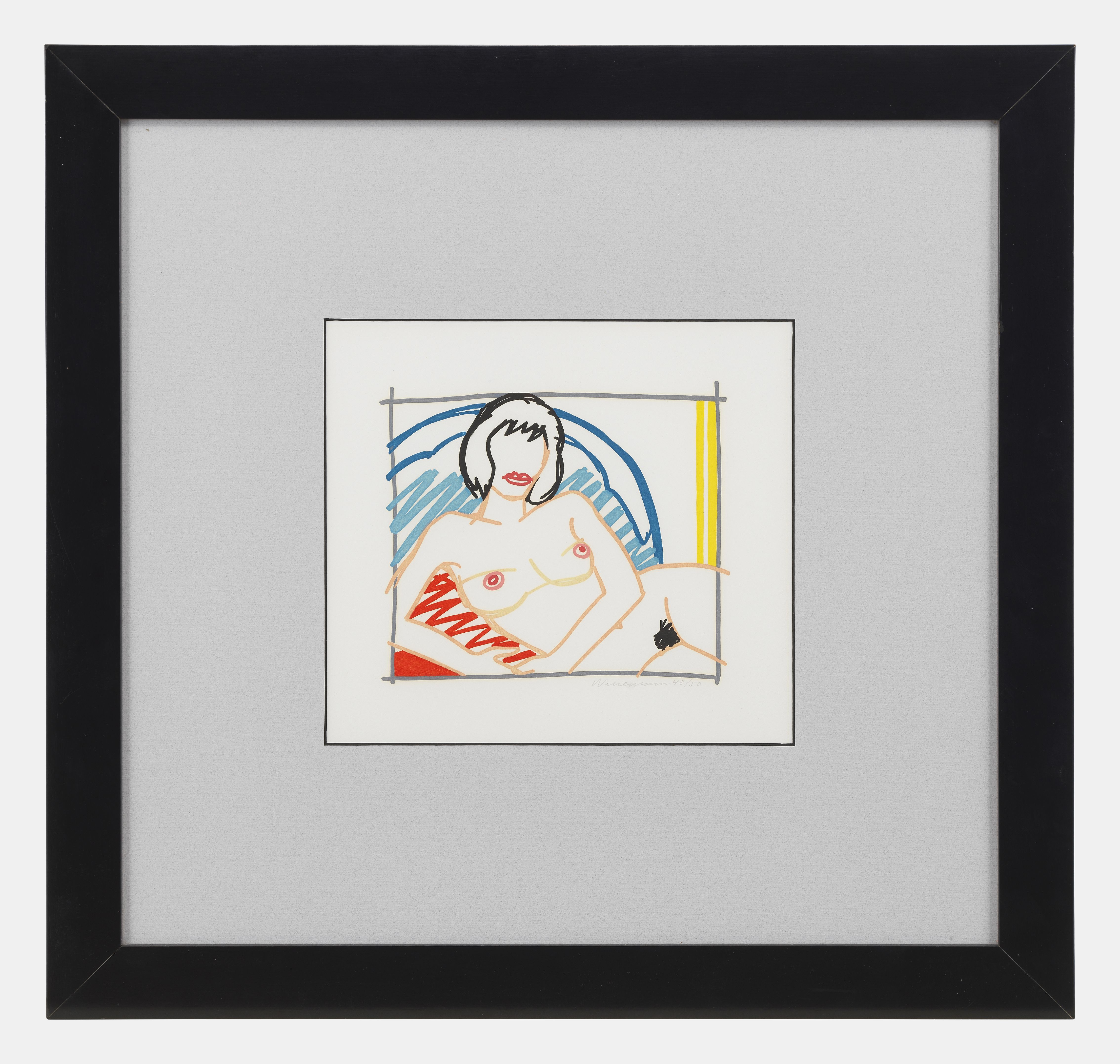 Monica Nude with Yellow Curtain (1991), aquatinte en couleurs, signée et numérotée à la mine de plomb 48/50, 22,5x24 cm. Provenance: vente Koller, 27 juin 2016, lot no 3718.