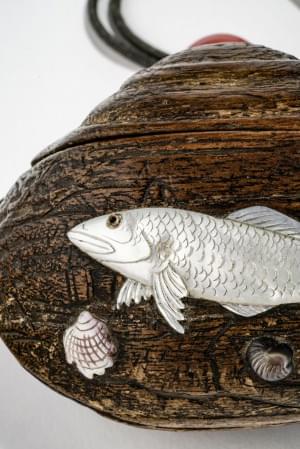 Bois à décor incrusté de nacre figurant des poissons et coquillages, netsuke en forme de châtaigne, signé Shibayama, , L 10 cm