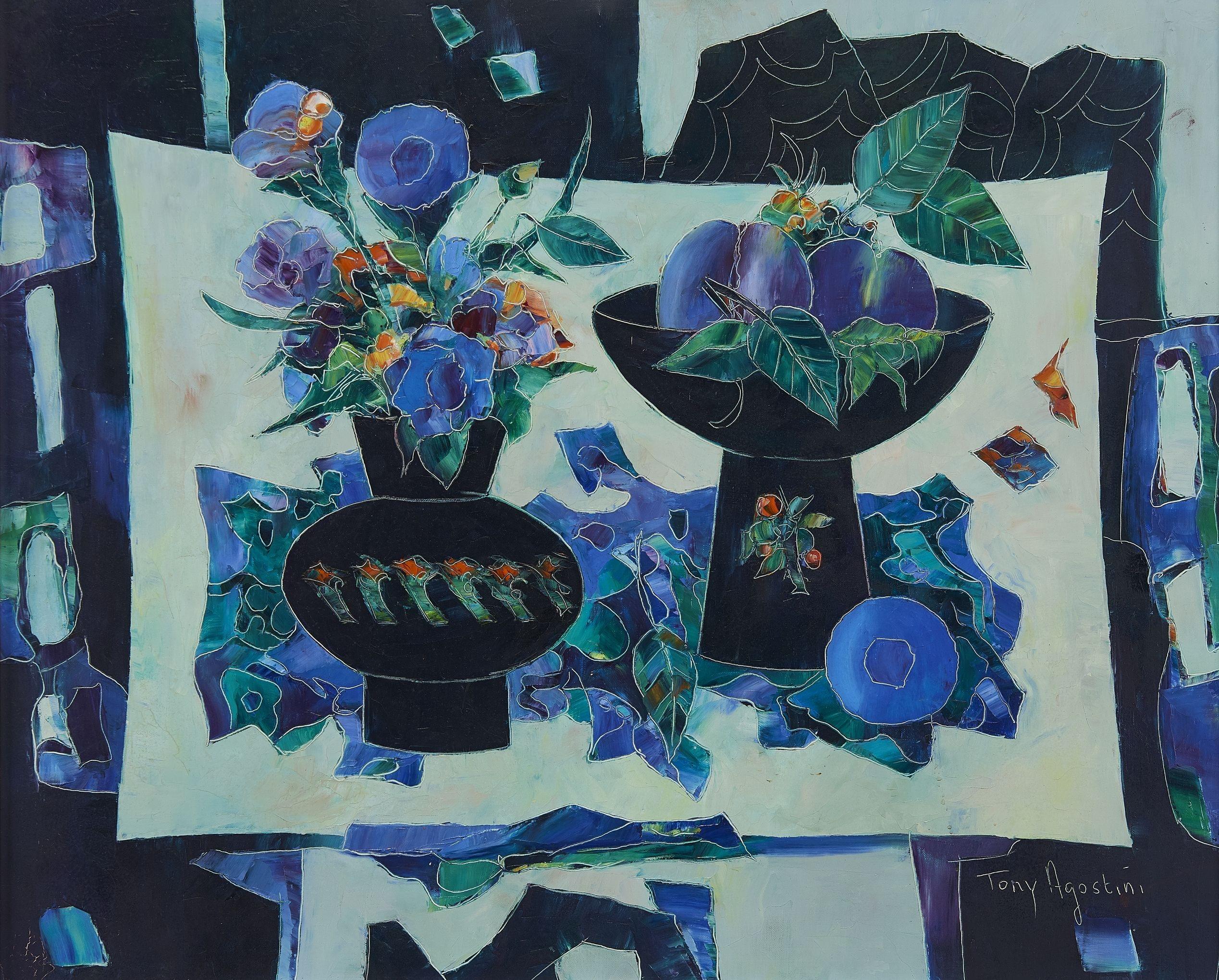 Coupe et vase sur table blanche, huile sur toile, signée, 49x60 cm