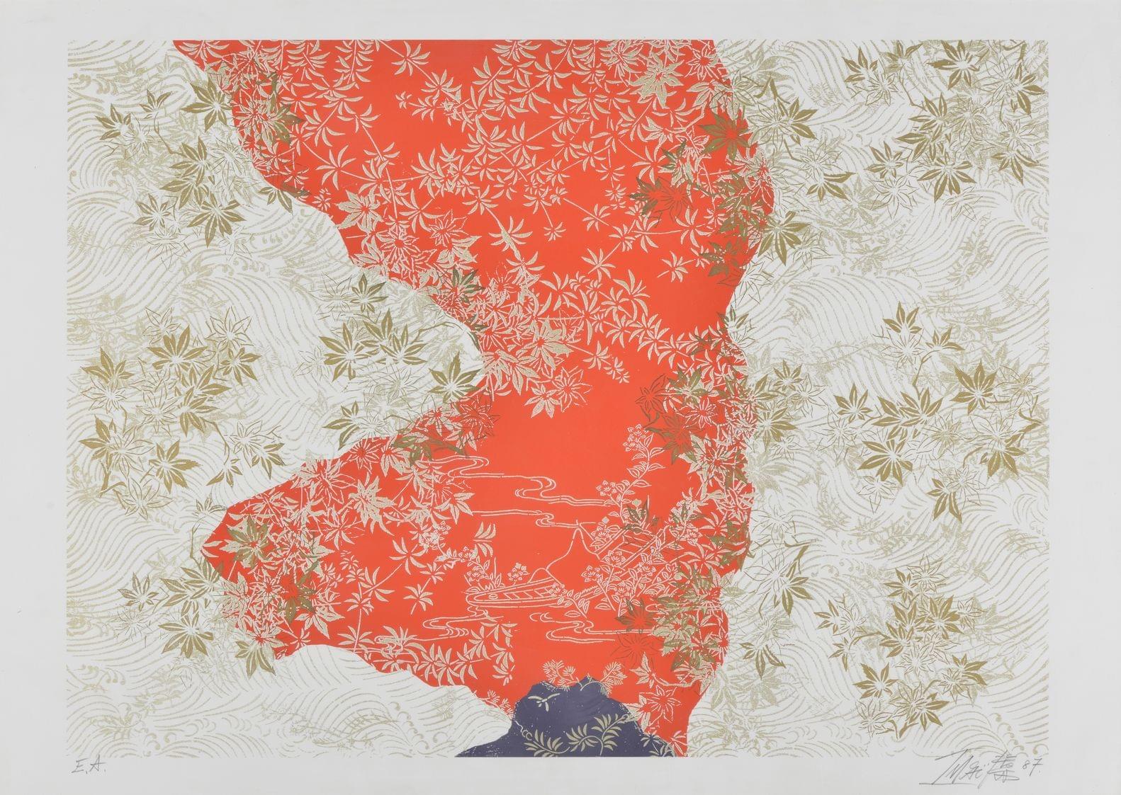 Composition au feuillage sur fond bleu, rouge et blanc (1987), lithographie signée, épreuve d'artiste, 75x105 cm