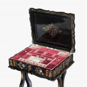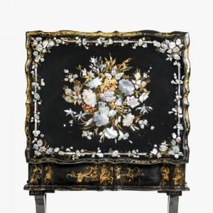 A décor de fleurs marquetées en nacre et feuillages peints doré, bois noirci, bronze, 77x52x43 cm