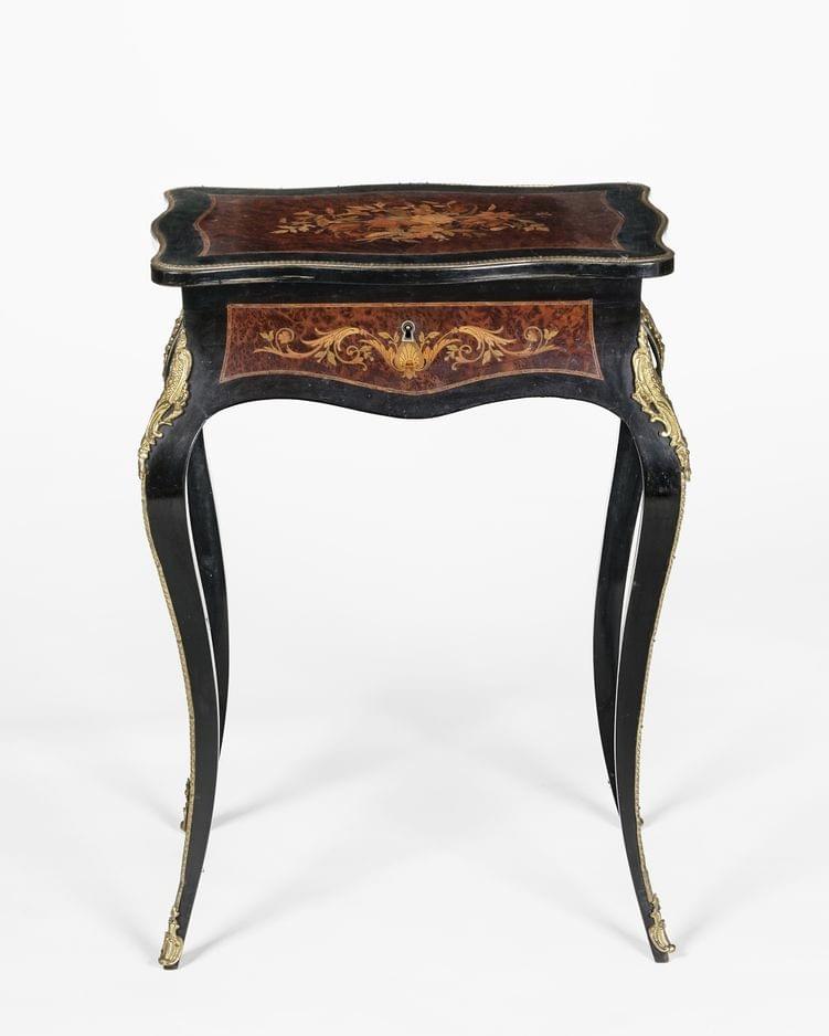 Un abattant, pieds galbés, bois noirci et marqueterie de fleurs sur un fond de ronces de thuya, bronze doré, 70x49x35 cm. Provenance: Château fribourgeois