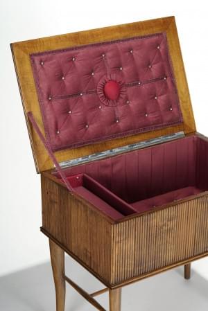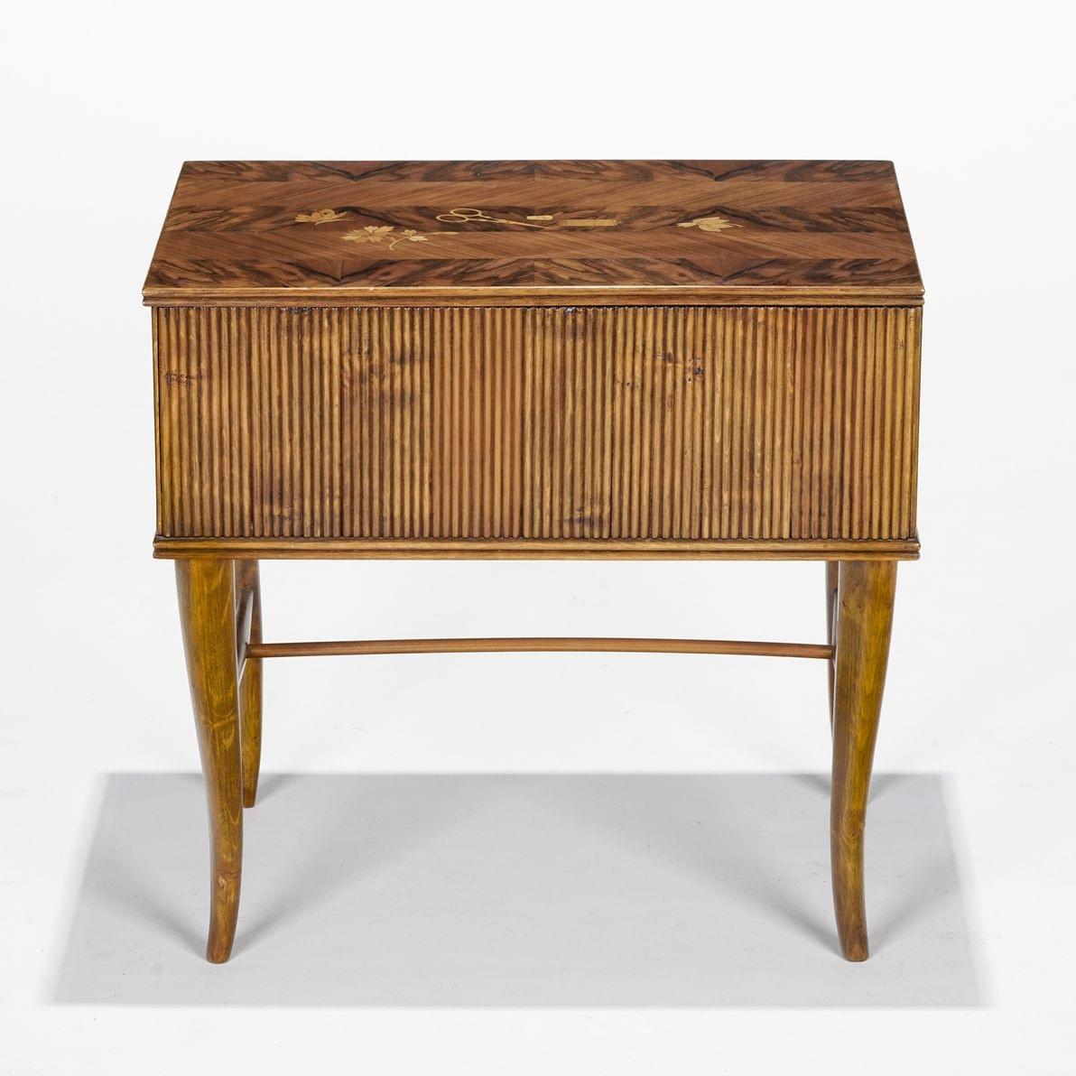 Placage de bois fruitier à décor marqueté de bobines, ciseaux, fleurs et papillons, un abattant, pieds cambrés, 59x61x40 cm
