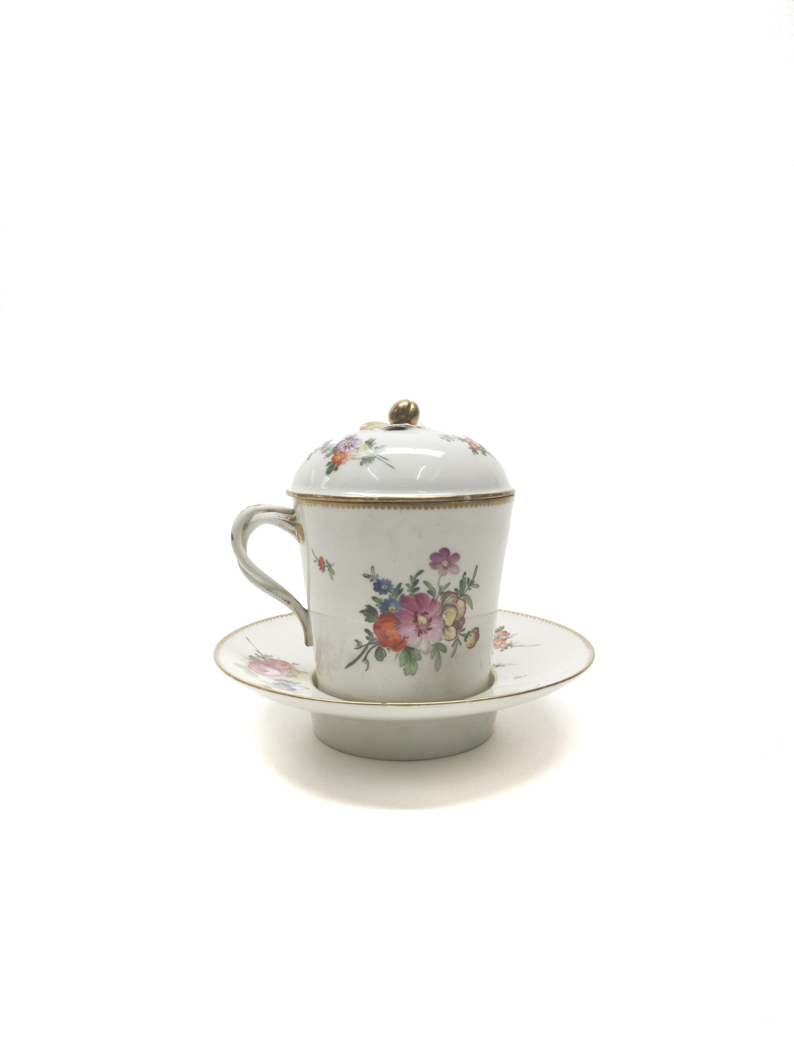 ParisClignancourt, manufacture de Monsieur Porcelaine, à décor de fleurs polychromes, 10x9 et D de la soucoupe 16,5 cm