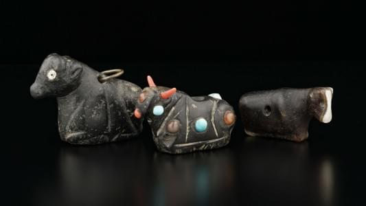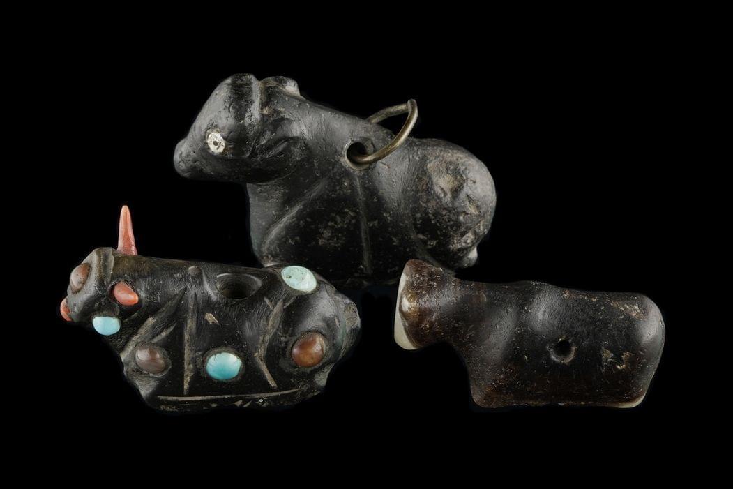 48. 3 amulettes figurant des bovidés au repos, calcite et marbre, Dj...