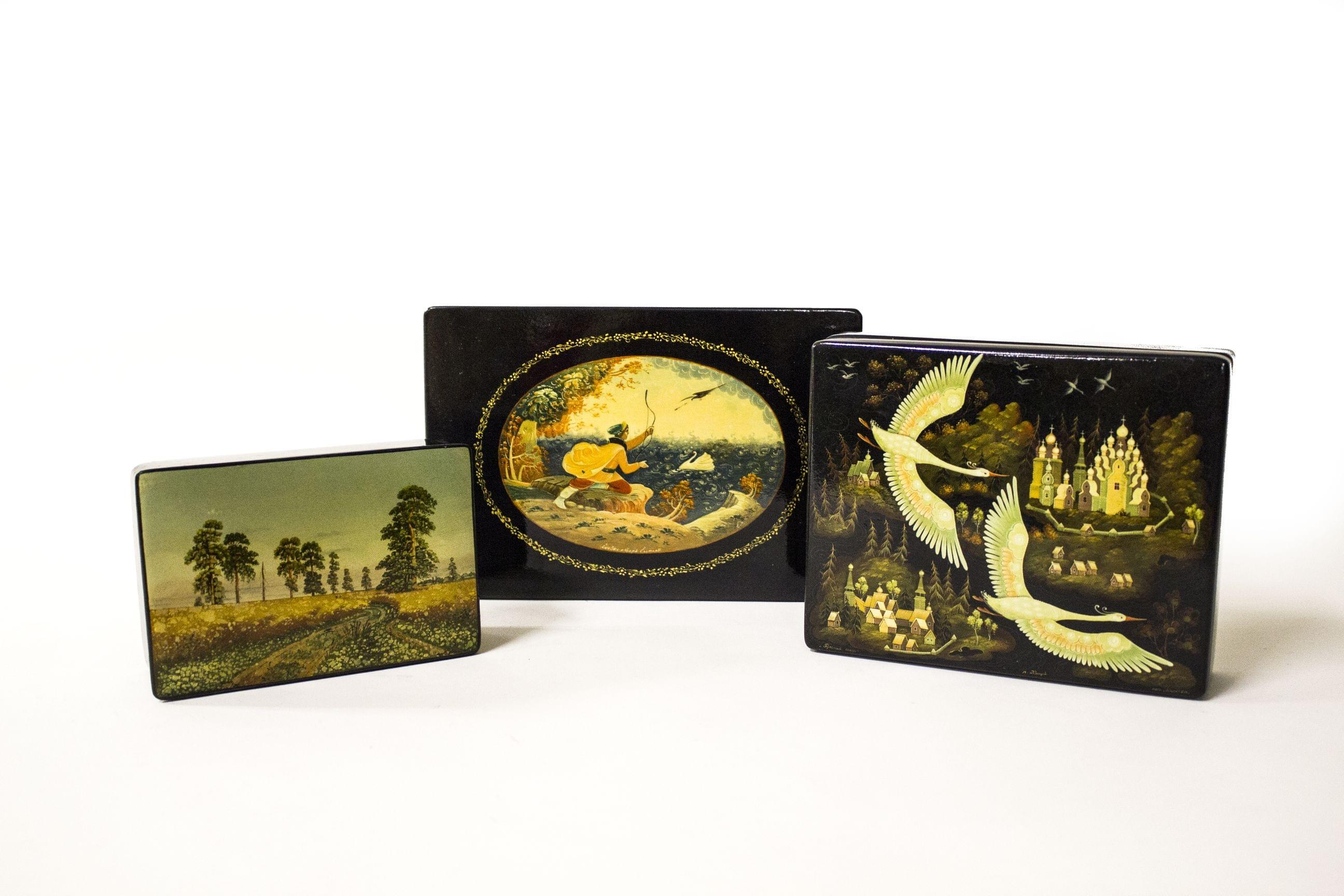 Carton bouilli à décor peint, à décor d'un paysage, deux cygnes en vol et un chasseur, L de 13 à 20 cm