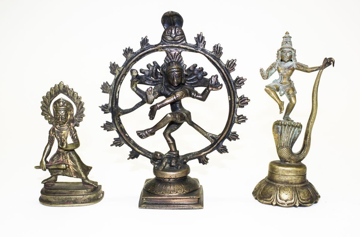 3563. Trois divinités hindoues: Shiva Natarâja, Krishna sur le serpent kaliya et divinité portant une massue gada, Inde