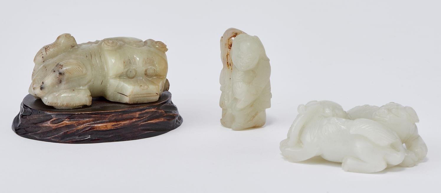 Jade clair figurant un félin, un personnage et deux félins affrontés, L de 4,5 à 7 cm