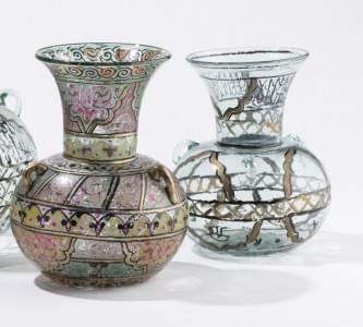 3 anneaux de suspensions chacunes, verre peint noir et or, Syrie, XIXe s, H 20 à 29 cm