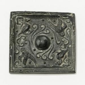 Bronze, l'un carré orné d'oiseaux volant et au sol, l'autre de personnages couchés sur fond d'entrelacs, le dernier à bord étoilé à décor d'oiseaux, 3,6 - 6,8 et 3,7 cm