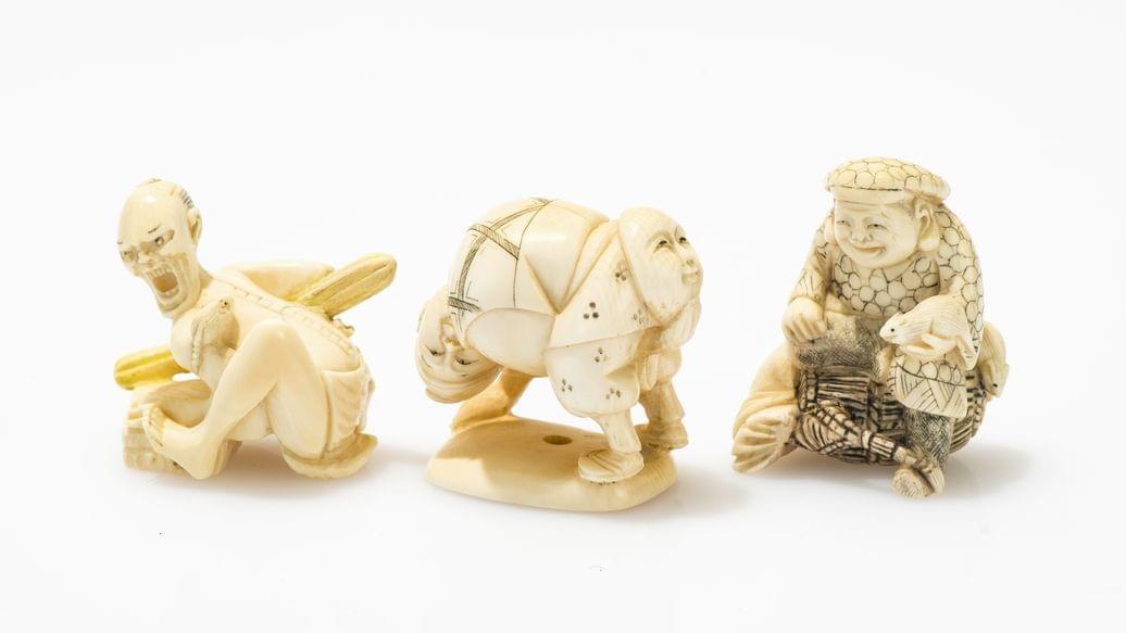 240. Trois netsukes figurant trois saltimbanques
