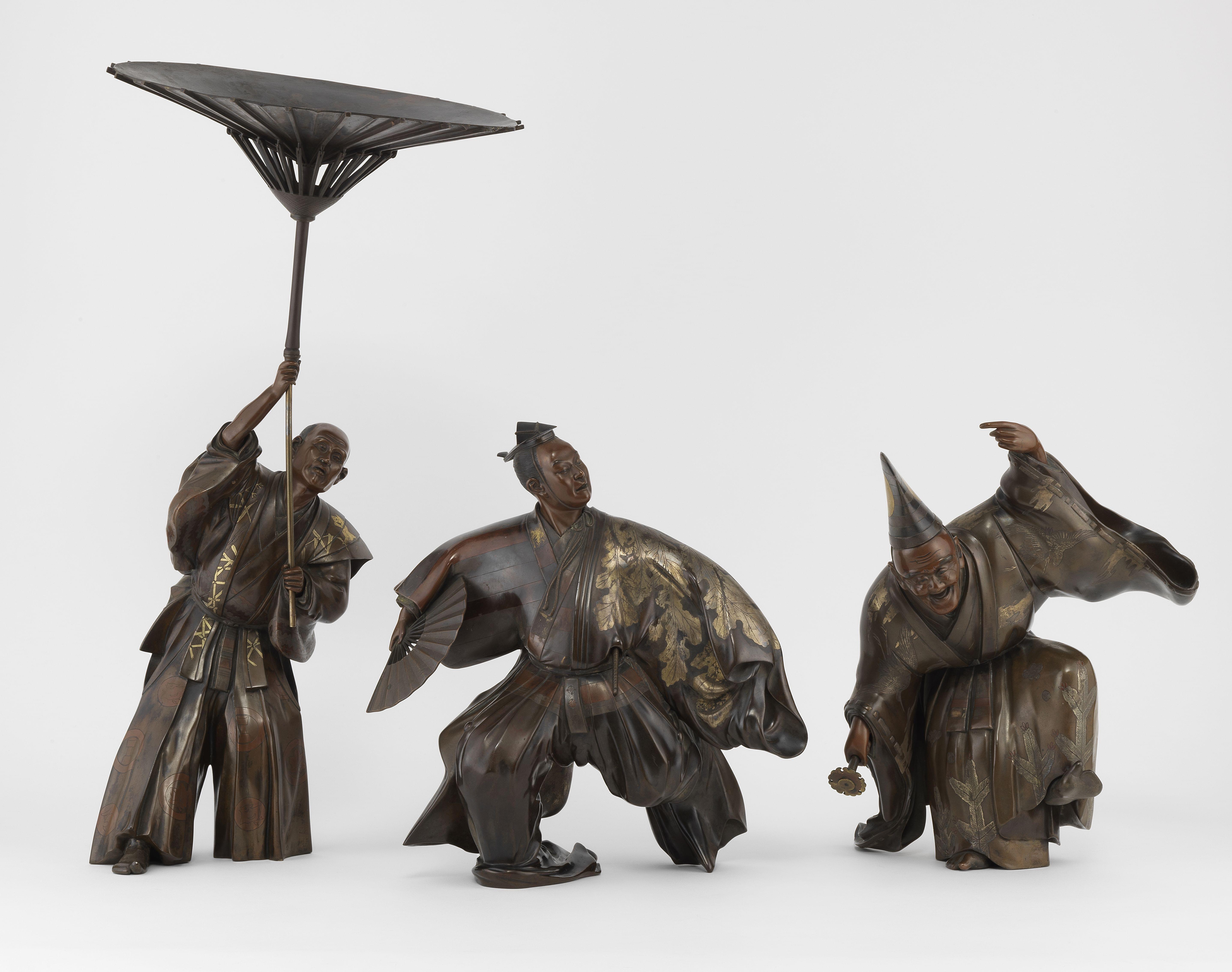 400. Trois okimonos représentant des danseurs de théâtre Kabuki, Japon, époque Meiji