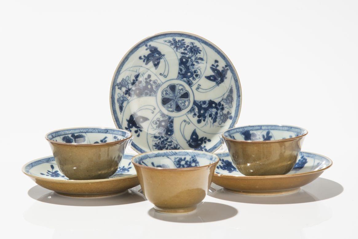 Porcelaine émaillée à décor bleu et blanc, fond capucin, Chine, dynastie Qing (1644-1912), D 11,5 cm et 4 cm