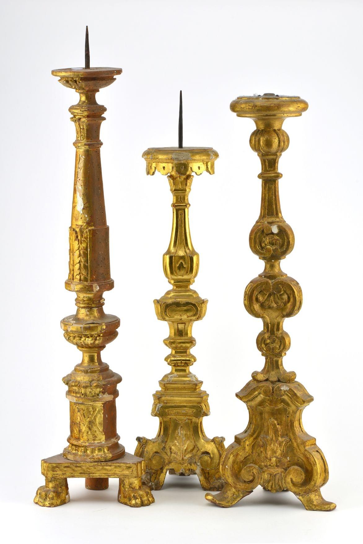 Bois sculpté et doré, l'un pieds griffe, les deux autres en enroulement, Italie, XVIIIe s, H 61, 70 et 75 cm