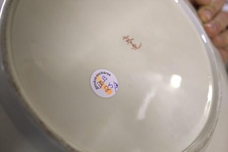 Porcelaine émaillée rouge et or à décor de femmes, hérons et paons, D 30 et 33 cm