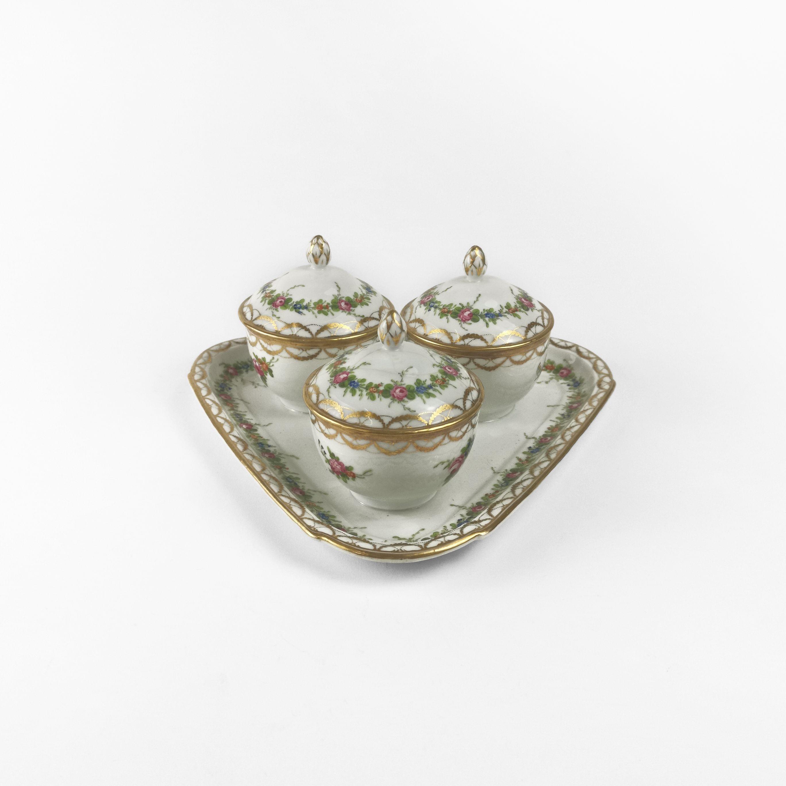 4517. Trois pots couverts sur plateau triangulaire à motif de guirlandes de fleurs
