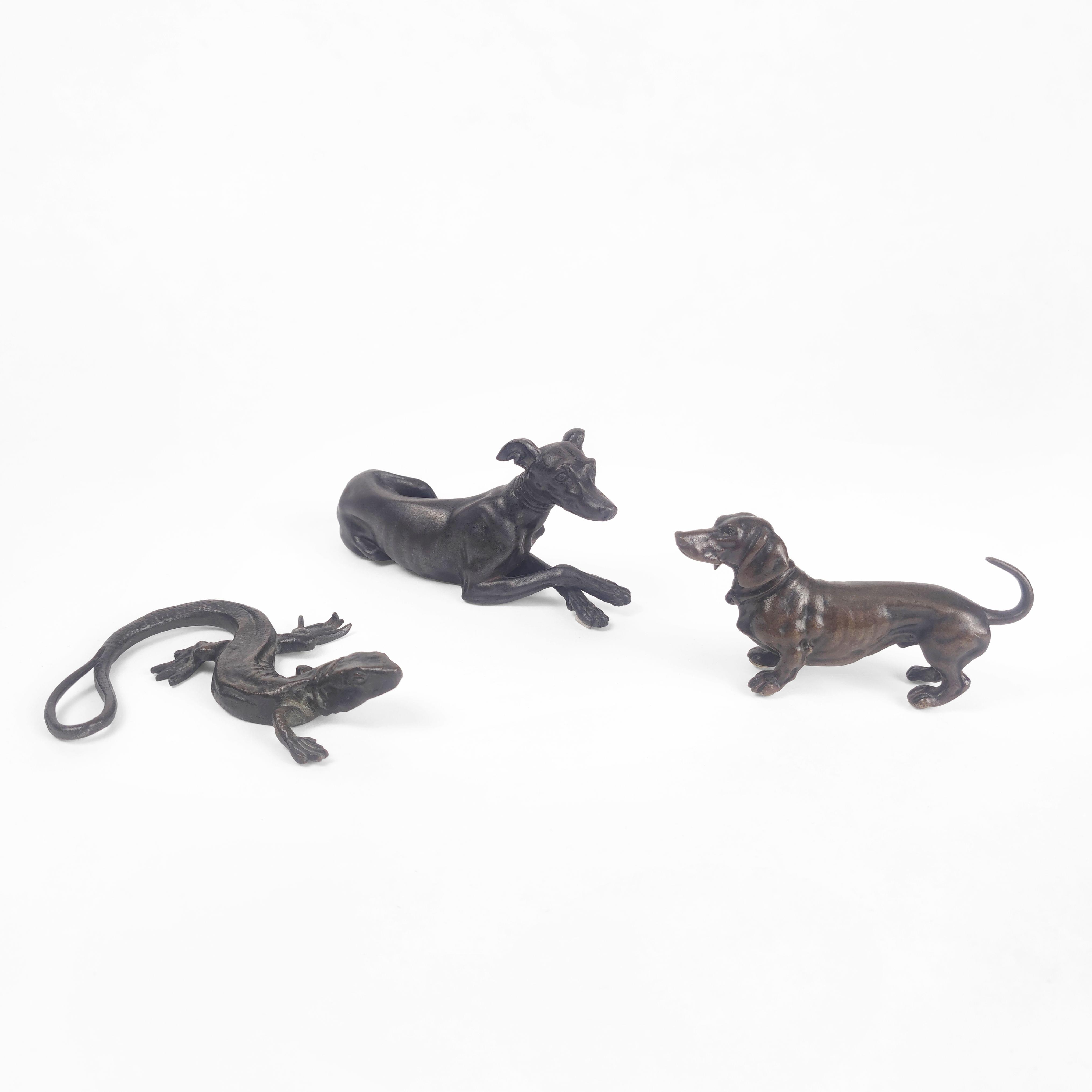 4075. Trois sculptures figurant un lévrier, un teckel et un lézard