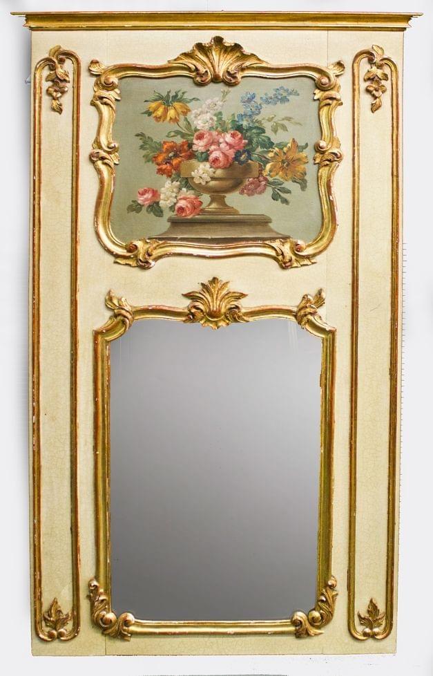 Bois laqué beige rechampi or, glace surmontée d'une huile figurant un bouquet de fleurs, 160 x 87 cm