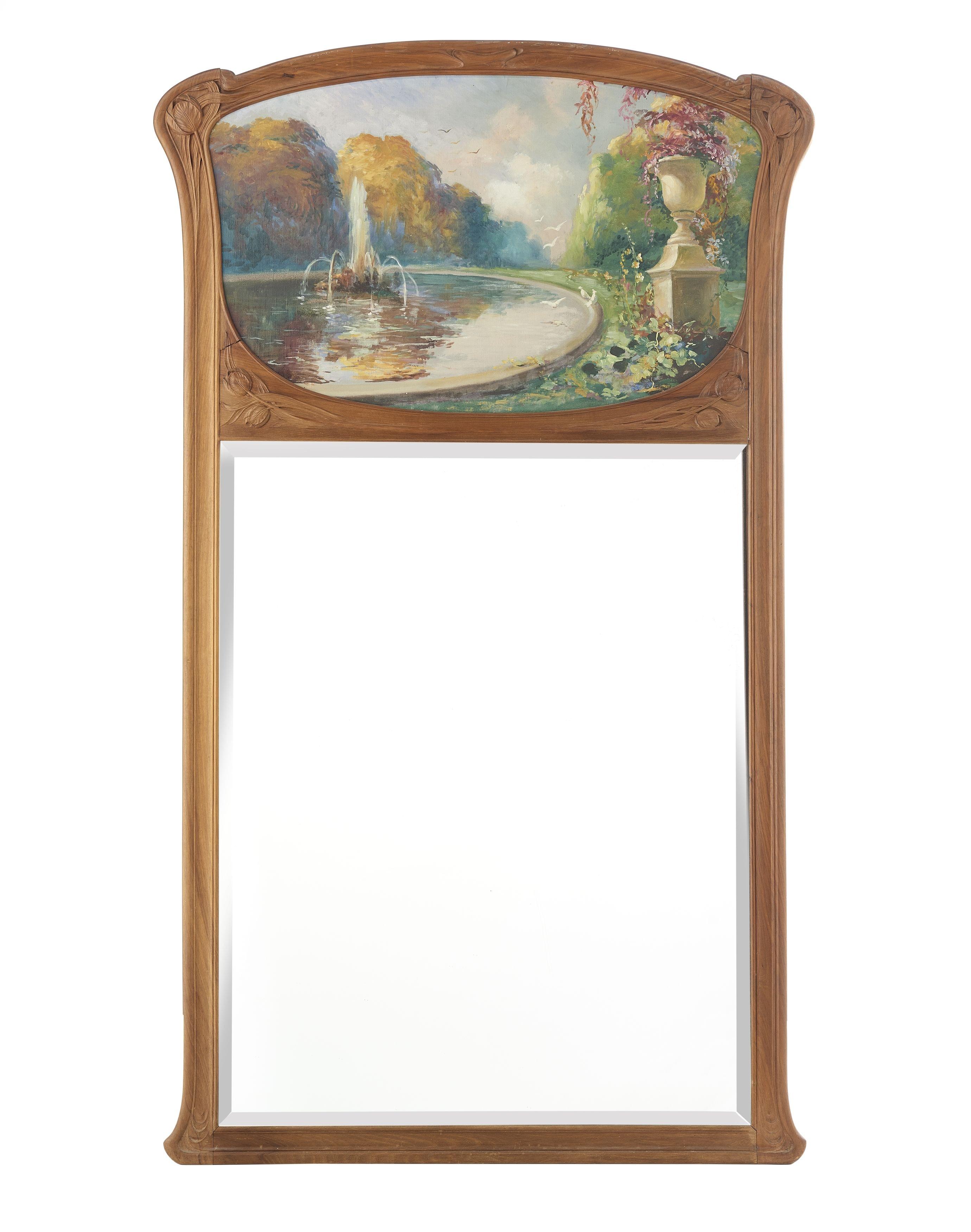 Bois au naturel et miroir surmonté d'une huile figurant une fontaine, 186x110 cm