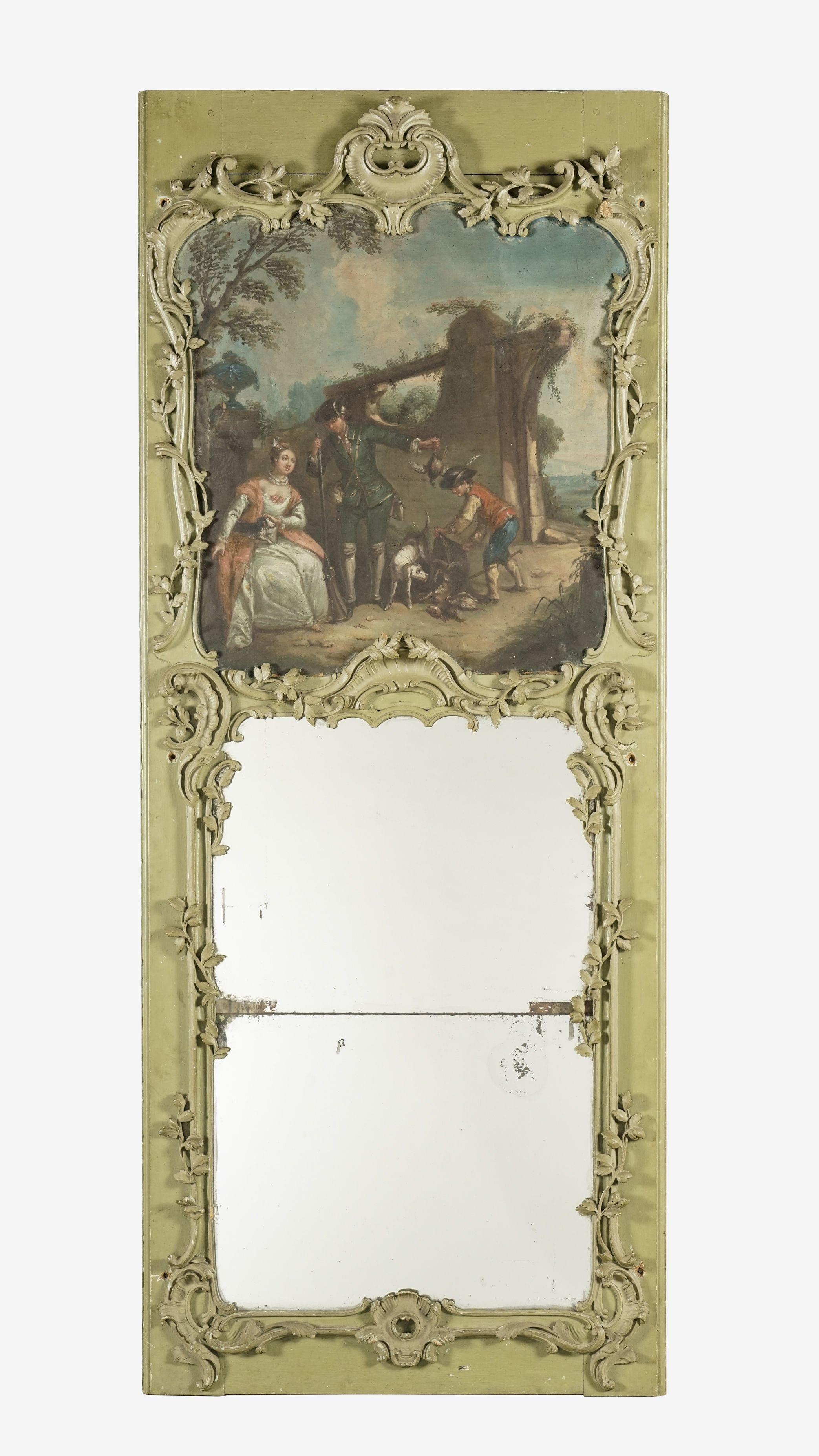 A décor peint sur toile d'une scène animée avec un militaire, bois sculpté et laqué vert à décor de coquilles et rinceaux, 214x87 cm